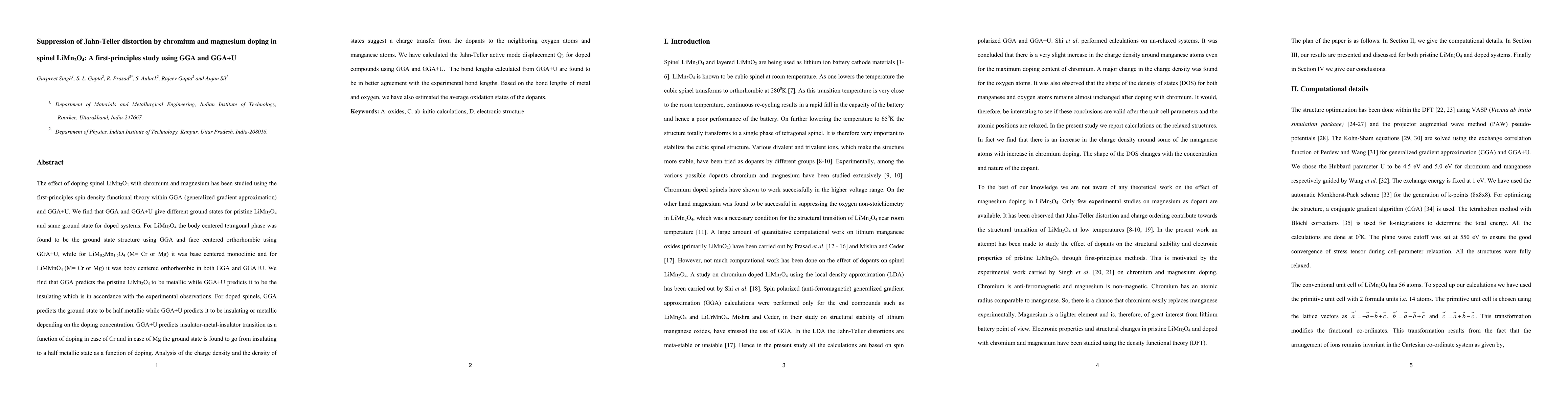 This study explores the suppression of Jahn-Teller distortion in spinel LiMn2O4 via chromium and magnesium doping using first-principles calculations. GGA and GGA+U methods yield different ground states for pristine LiMn2O4 but consistent results for doped systems, with GGA+U better matching experimental observations.