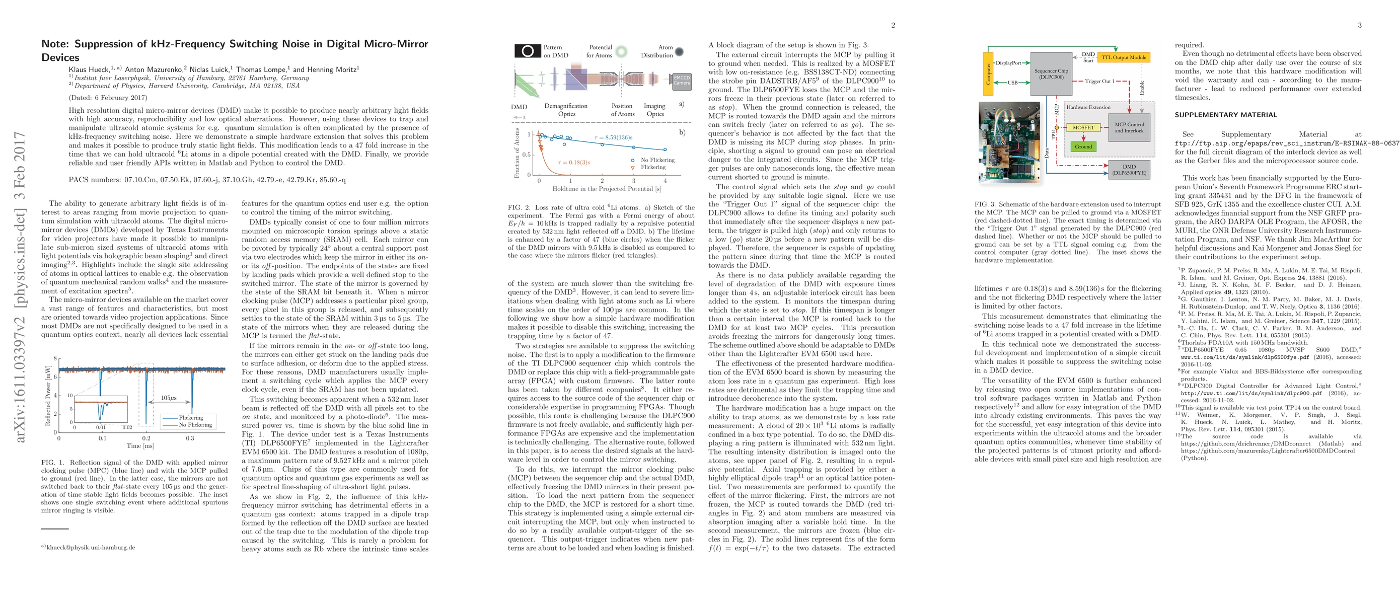This paper presents a hardware modification to suppress kHz-frequency switching noise in digital micro-mirror devices (DMD), significantly improving their use in quantum simulation. The solution enables a 47-fold increase in holding ultracold $^6$Li atoms in a dipole potential created by the DMD, along with user-friendly APIs for control in Matlab and Python.