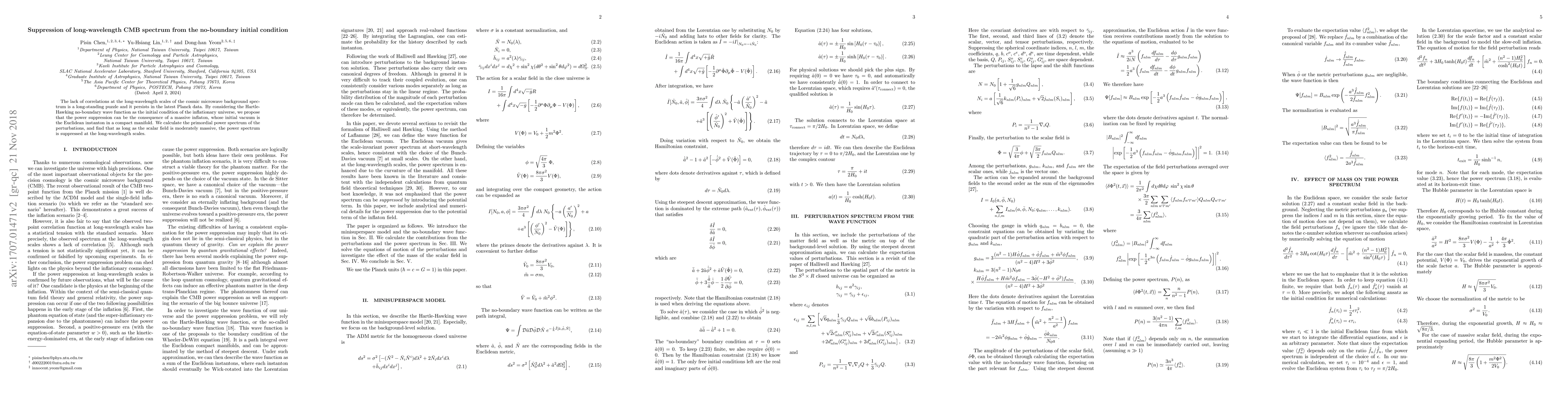 The paper proposes that the Hartle-Hawking no-boundary wave function can explain the suppression of long-wavelength CMB spectrum through a massive inflaton, leading to a suppressed primordial power spectrum at these scales. This offers a potential resolution to the long-standing puzzle of the lack of correlations in the CMB spectrum.