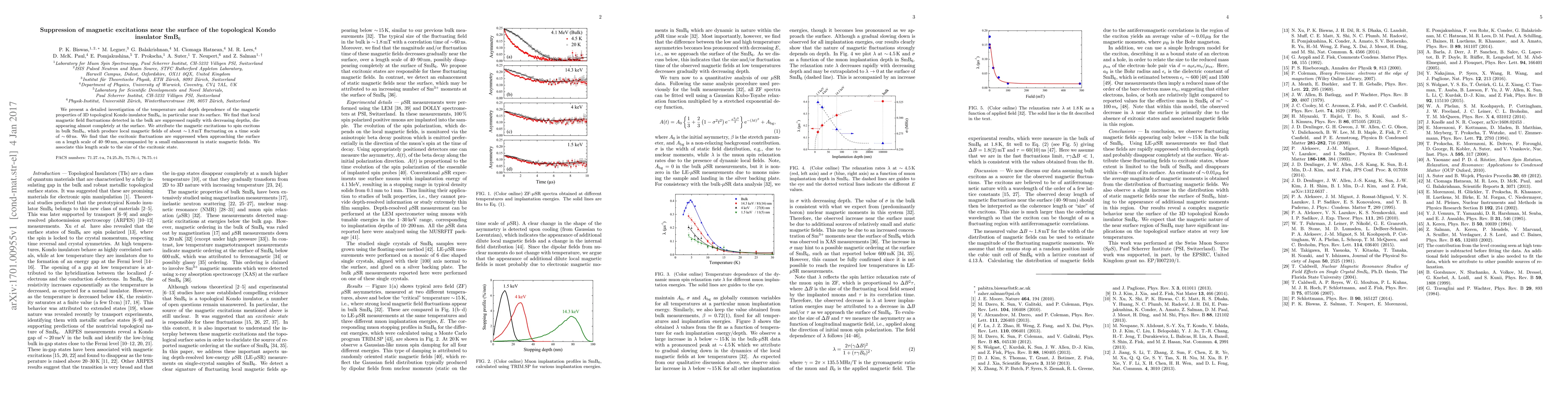 This study investigates the magnetic properties of the topological Kondo insulator SmB6, revealing that bulk magnetic excitations, attributed to spin excitons, are rapidly suppressed near the surface, disappearing almost completely within a depth of 40-90 nm. This suppression correlates with a small enhancement in static magnetic fields at the surface.
