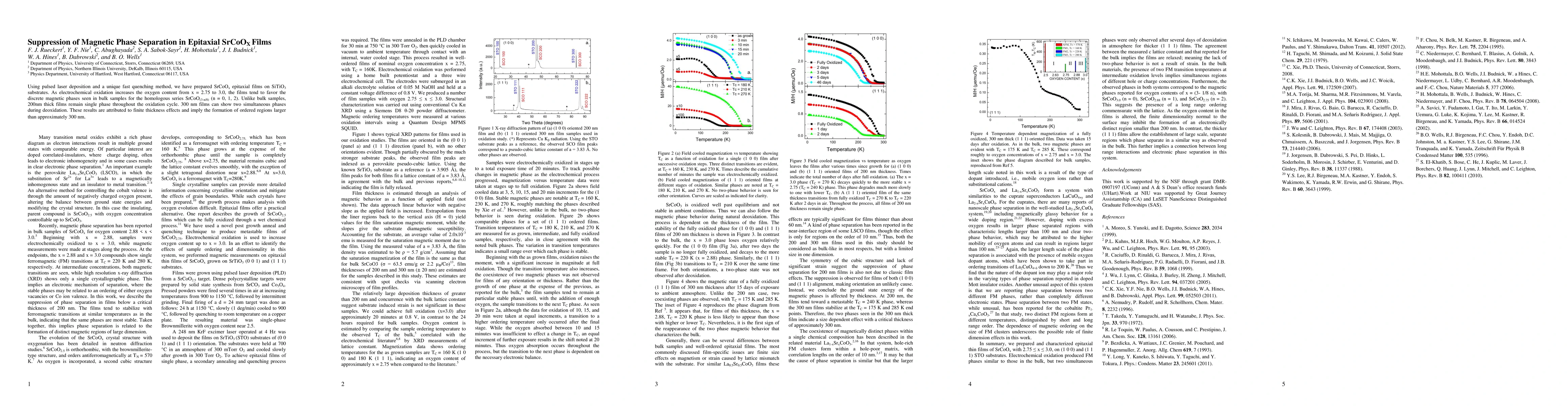 This paper investigates SrCoOx epitaxial films prepared using pulsed laser deposition and fast quenching, revealing that while bulk samples exhibit discrete magnetic phases, 200nm thick films remain single phase during oxidation, suggesting suppression of magnetic phase separation due to finite thickness effects.