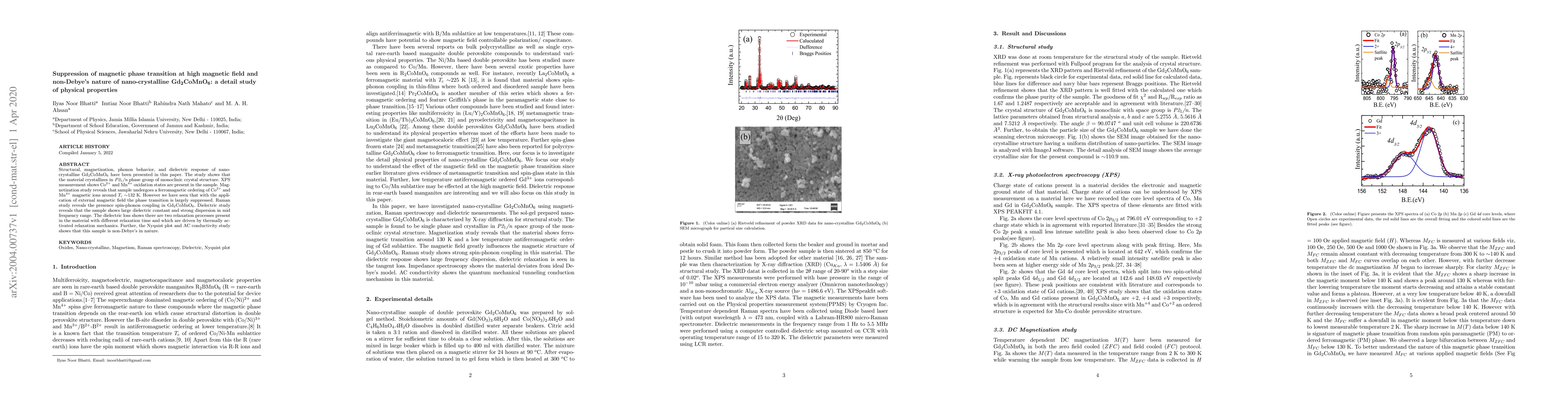 This study investigates the physical properties of nano-crystalline Gd$_2$CoMnO$_6$, revealing its monoclinic crystal structure and ferromagnetic ordering at $\sim$132 K. High magnetic fields suppress the magnetic phase transition, while Raman and dielectric studies indicate spin-phonon coupling and non-Debye dielectric behavior with multiple relaxation processes.
