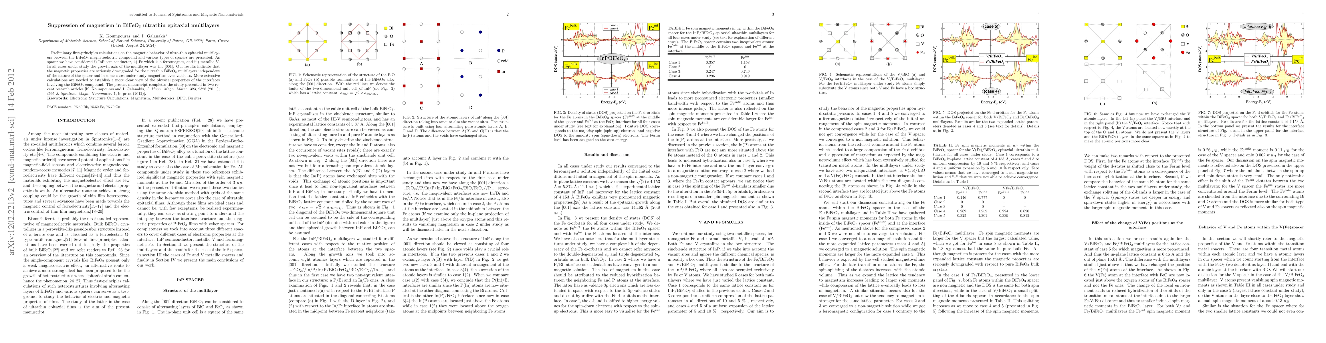 The present manuscript completes the study presented in two recent research articles [K. Koumpouras and I. Galanakis, \textit{J. Magn. Magn. Mater.} 323, 2328 (2011); \textit{ibid}, \textit{J. Spintron. Magn. Nanomater.} 1, in press]. Preliminary first-principles calculations using the QUANTUM-espresso package [P. Giannozzi et al \textit{J. Phys.:Condens. Matter} 21, 395502 (2009)] on the magnetic behavior of ultra-thin epitaxial multilayers between the BiFeO$_3$ magnetoelectric compound and various types of spacers are presented. As spacer we have considered i) InP semiconductor, ii) Fe which is a ferromagnet, and iii) metallic V. In all cases under study the growth axis of the multilayer was the [001]. Our results indicate that the magnetic properties are seriously downgraded for the ultrathin BiFeO$_3$ multilayers independent of the nature of the spacer and in some cases under study magnetism even vanishes. More extensive calculations are needed to establish a more clear view of the physical properties of the interfaces involving the BiFeO$_3$ compound.