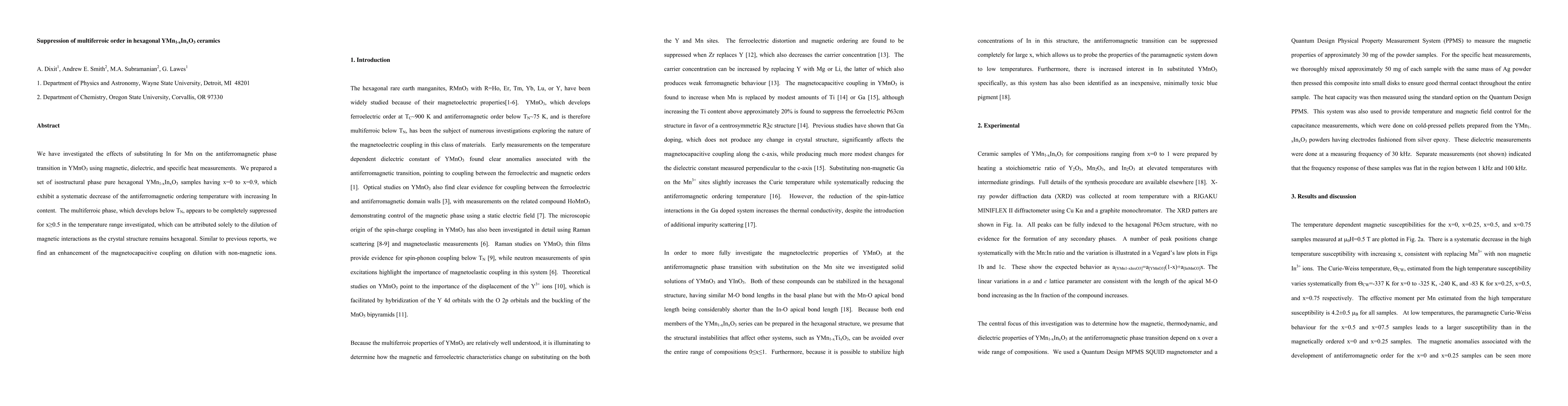Researchers investigated how replacing manganese with indium in a specific ceramic affects its magnetic properties, finding that higher levels of indium suppress the multiferroic order and enhance magnetocapacitive coupling.