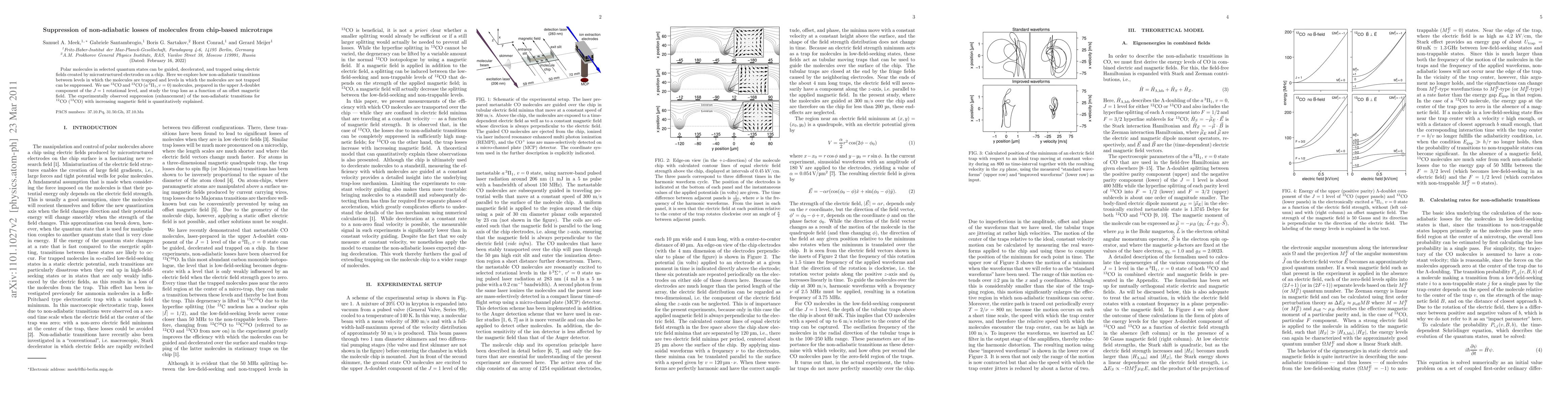 Polar molecules in selected quantum states can be guided, decelerated and trapped using electric fields created by microstructured electrodes on a chip. Here we explore how non-adiabatic transitions between levels in which the molecules are trapped and levels in which the molecules are not trapped can be suppressed. We use 12-CO and 13-CO (a 3-Pi(1), v=0) molecules, prepared in the upper Lambda-doublet component of the J=1 rotational level, and study the trap loss as a function of an offset magnetic field. The experimentally observed suppression (enhancement) of the non-adiabatic transitions for 12-CO (13-CO) with increasing magnetic field is quantitatively explained.