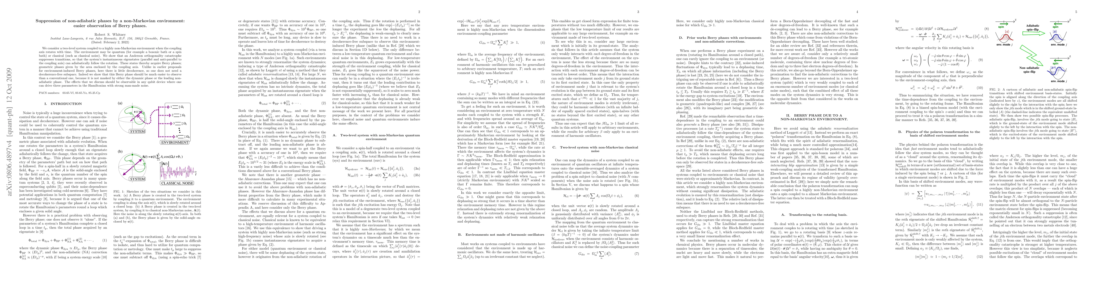 We consider a two-level system coupled to a highly non-Markovian environment when the coupling axis rotates with time. The environment may be quantum (for example a bosonic bath or a spin bath) or classical (such as classical noise). We show that an Anderson orthogonality catastrophe suppresses transitions, so that the system's instantaneous eigenstates (parallel and anti-parallel to the coupling axis) can adiabatically follow the rotation. These states thereby acquire Berry phases; geometric phases given by the area enclosed by the coupling axis. Unlike in earlier proposals for environment-induced Berry phases, here there is little decoherence, so one does not need a decoherence-free subspace. Indeed we show that this Berry phase should be much easier to observe than a conventional one, because it is not masked by either the dynamic phase or the leading non-adiabatic phase. The effects that we discuss should be observable in any qubit device where one can drive three parameters in the Hamiltonian with strong man-made noise.