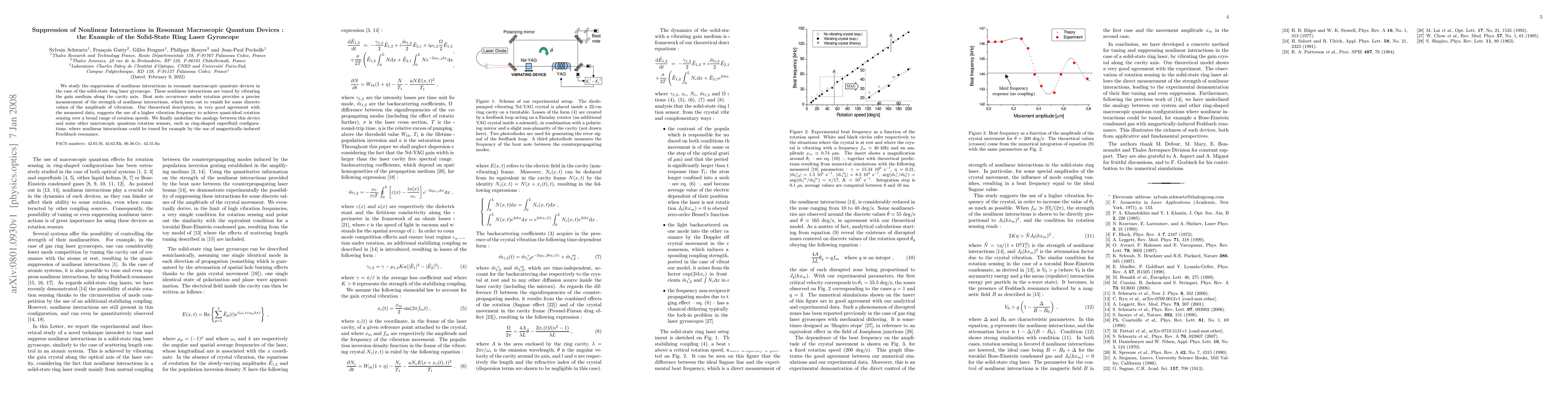 This paper investigates the suppression of nonlinear interactions in resonant macroscopic quantum devices, specifically focusing on a solid-state ring laser gyroscope. By vibrating the gain medium, the study finds that nonlinear interactions can be minimized at certain discrete vibration amplitudes, suggesting that higher vibration frequencies may enable quasi-ideal rotation sensing across various speeds.
