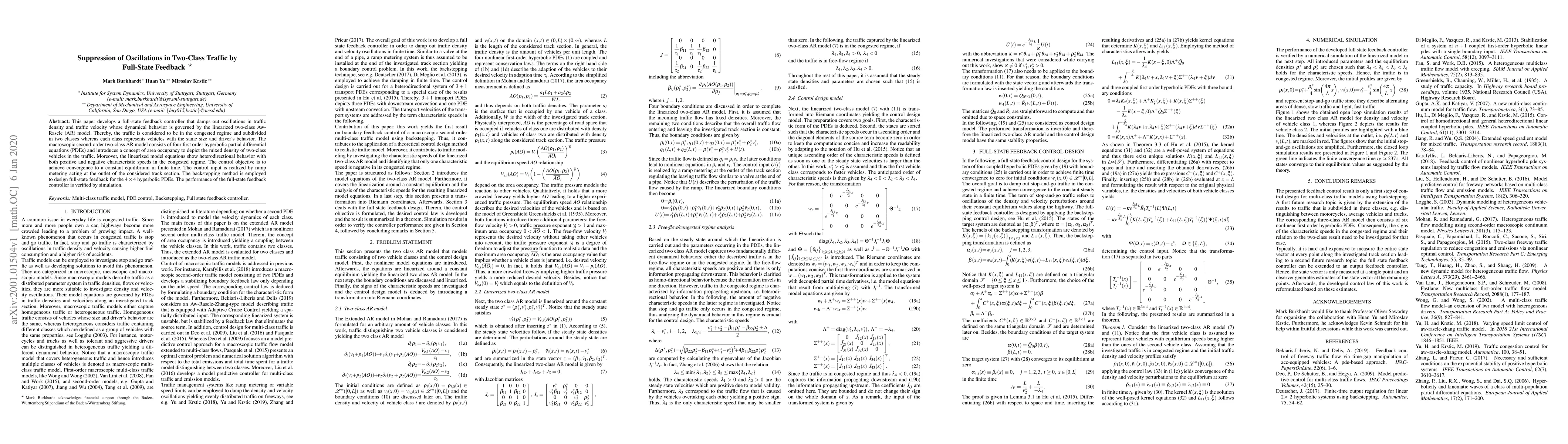 Researchers developed a full-state feedback controller to suppress oscillations in traffic density and velocity, achieving convergence to a constant equilibrium in finite time using the linearized two-class Aw-Rascle model.
