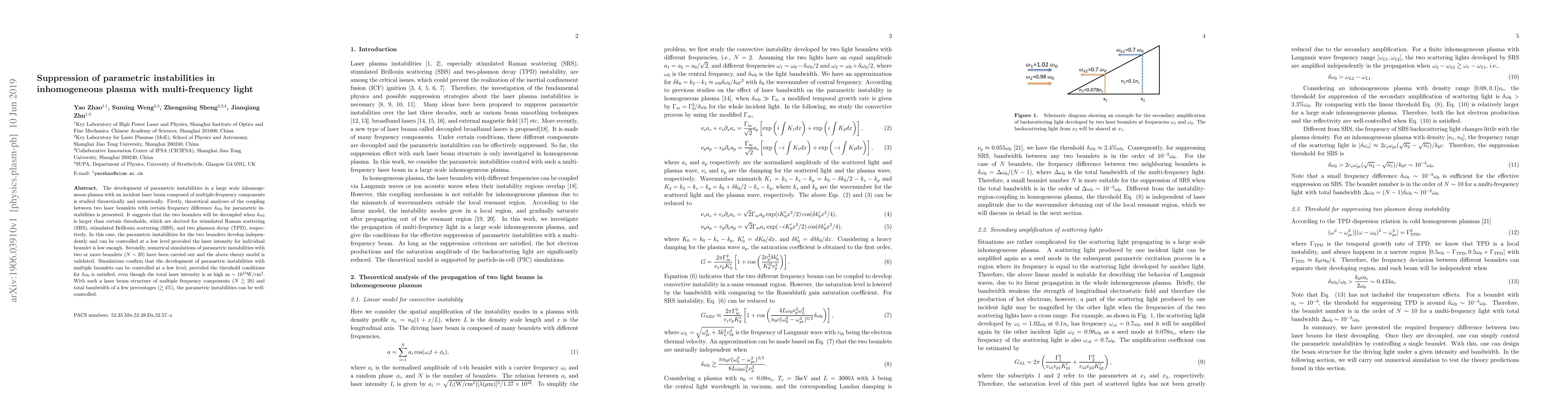 This paper theoretically and numerically investigates the suppression of parametric instabilities in inhomogeneous plasma using a multi-frequency laser beam. It demonstrates that decoupling of beamlets with a sufficient frequency difference can control instabilities, validated by simulations showing effective control even at high laser intensities.