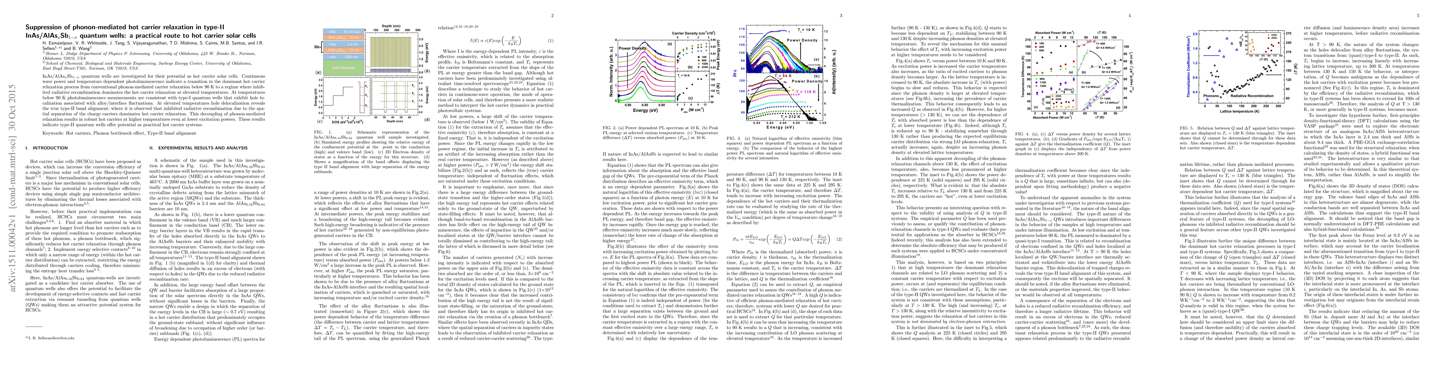 This study investigates InAs/AlAs$_{x}$Sb$_{1-x}$ quantum wells for their potential in hot carrier solar cells, finding a transition from phonon-mediated relaxation to inhibited radiative recombination at elevated temperatures, indicating a practical route for such applications. The type-II band alignment at higher temperatures suppresses phonon-mediated relaxation, leading to robust hot carriers even at lower excitation powers.