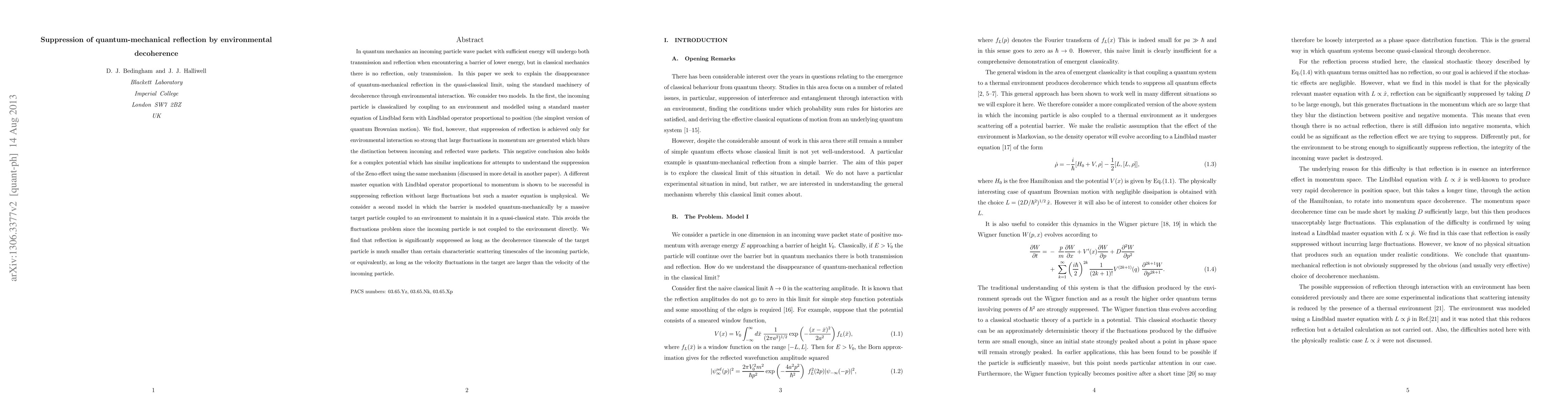 This paper investigates the suppression of quantum-mechanical reflection in the quasi-classical limit through environmental decoherence. The study finds that while a classicalized particle model can suppress reflection, it requires extreme environmental interaction causing large momentum fluctuations. A more promising model involves a quantum-mechanically modeled barrier coupled to an environment, which effectively suppresses reflection without such fluctuations.