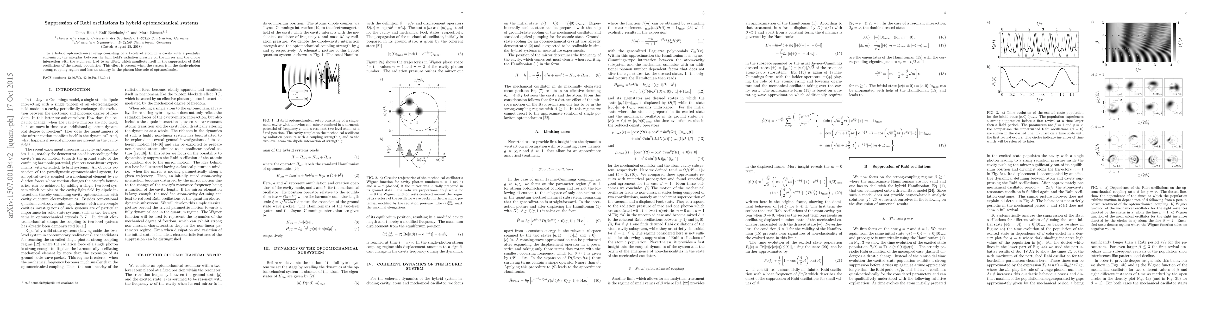 Summary: The study investigates a hybrid optomechanical system where a two-level atom interacts with a cavity and a movable mirror, revealing a blockade effect that suppresses Rabi oscillations due to the interplay between radiation pressure and dipole interaction, particularly in the single photon strong coupling regime. This phenomenon parallels the photon blockade in optomechanics.