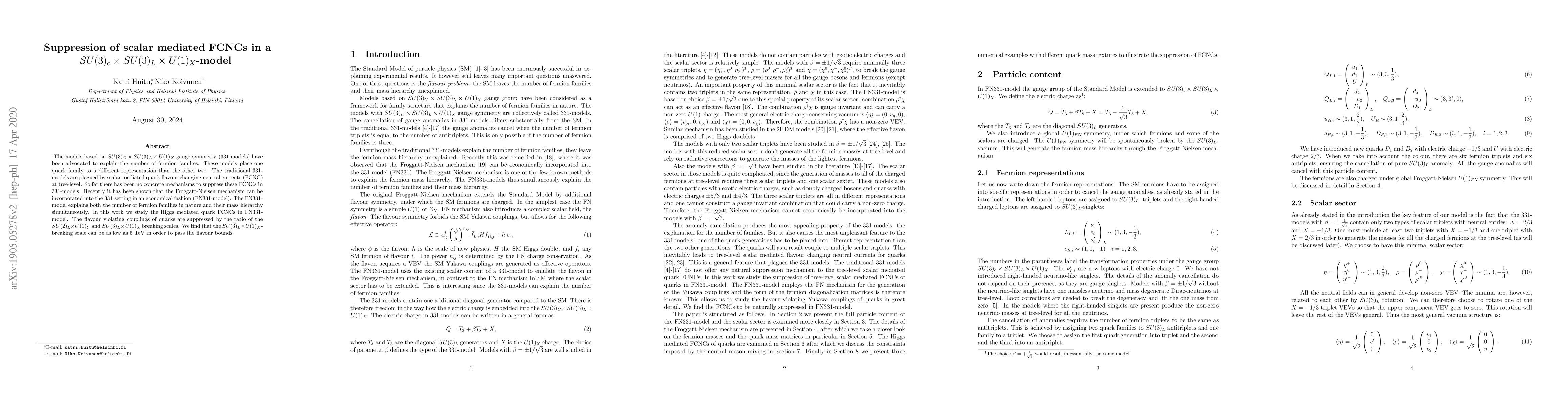 This research investigates the suppression of scalar-mediated flavour changing neutral currents (FCNCs) in a $SU(3)_c\times SU(3)_L\times U(1)_X$ model (FN331-model). It finds that Higgs-mediated FCNCs are suppressed by the ratio of the $SU(2)_L \times U(1)_Y$ and $SU(3)_L\times U(1)_X$ breaking scales, allowing the $SU(3)_L\times U(1)_X$-breaking scale to be as low as 5 TeV to meet flavour bounds.