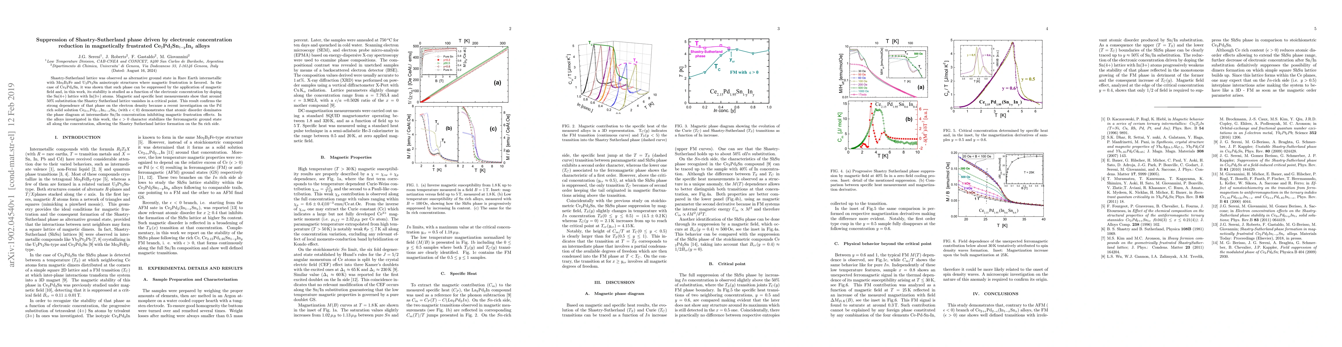 Shastry-Sutherland lattice was observed as alternative ground state in Rare Earth intermetallic with Mo$_2$B$_2$Fe and U$_2$Pt$_2$Sn anisotropic structures where magnetic frustration is favored. In the case of Ce$_2$Pd$_2$Sn, it was shown that such phase can be suppressed by the application of magnetic field and, in this work, its stability is studied as a function of the electronic concentration by doping the Sn(4+) lattice with In(3+) atoms. Magnetic and specific heat measurements show that around 50\% substitution the Shastry Sutherland lattice vanishes in a critical point. This result confirms the strong dependence of that phase on the electron density because a recent investigation on the Pd rich solid solution Ce$_{2+\epsilon}$Pd$_{2-\epsilon}$In$_{1-x}$Sn$_x$ (with $\epsilon < 0$) demonstrates that atomic disorder dominates the phase diagram at intermediate Sn/In concentration inhibiting magnetic frustration effects. In the alloys investigated in this work, the $\epsilon >0$ character stabilizes the ferromagnetic ground state all along the concentration, allowing the Shastry Sutherland lattice formation on the Sn rich side.