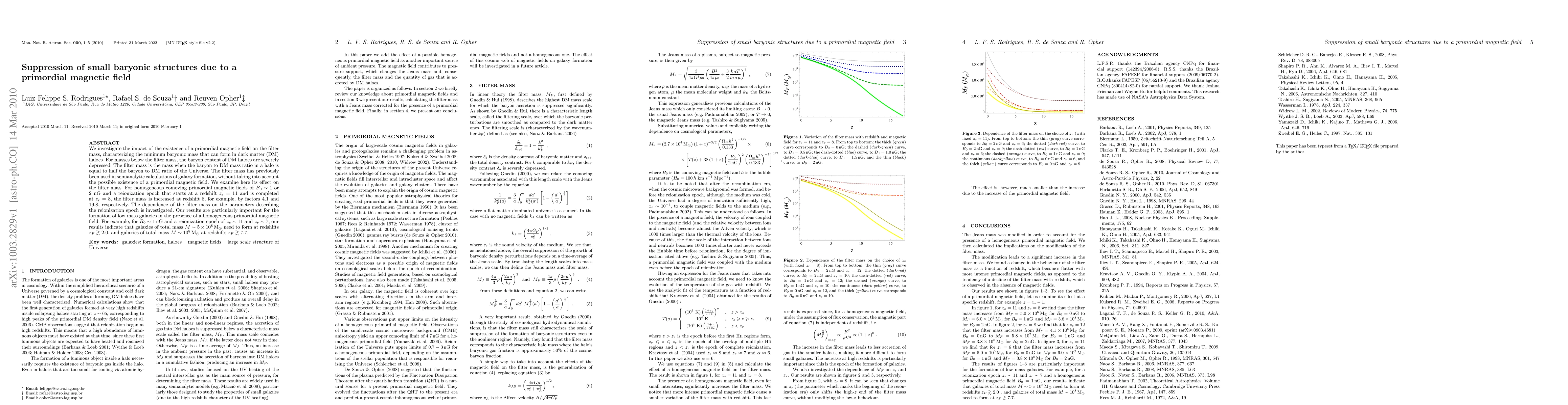 We investigate the impact of the existence of a primordial magnetic field on the filter mass, characterizing the minimum baryonic mass that can form in dark matter (DM) haloes. For masses below the filter mass, the baryon content of DM haloes are severely depressed. The filter mass is the mass when the baryon to DM mass ratio in a halo is equal to half the baryon to DM ratio of the Universe. The filter mass has previously been used in semianalytic calculations of galaxy formation, without taking into account the possible existence of a primordial magnetic field. We examine here its effect on the filter mass. For homogeneous comoving primordial magnetic fields of $B_0 \sim 1$ or 2 nG and a reionization epoch that starts at a redshift $z_s=11$ and is completed at $z_r=8$, the filter mass is increased at redshift 8, for example, by factors 4.1 and 19.8, respectively. The dependence of the filter mass on the parameters describing the reionization epoch is investigated. Our results are particularly important for the formation of low mass galaxies in the presence of a homogeneous primordial magnetic field. For example, for $B_0\sim 1\nG$ and a reionization epoch of $z_s\sim 11$ and $z_r\sim7$, our results indicate that galaxies of total mass $M\sim5 \times 10^8\msun$ need to form at redshifts $z_F\gtrsim 2.0$, and galaxies of total mass $M\sim10^8\msun$ at redshifts $z_F\gtrsim 7.7$.