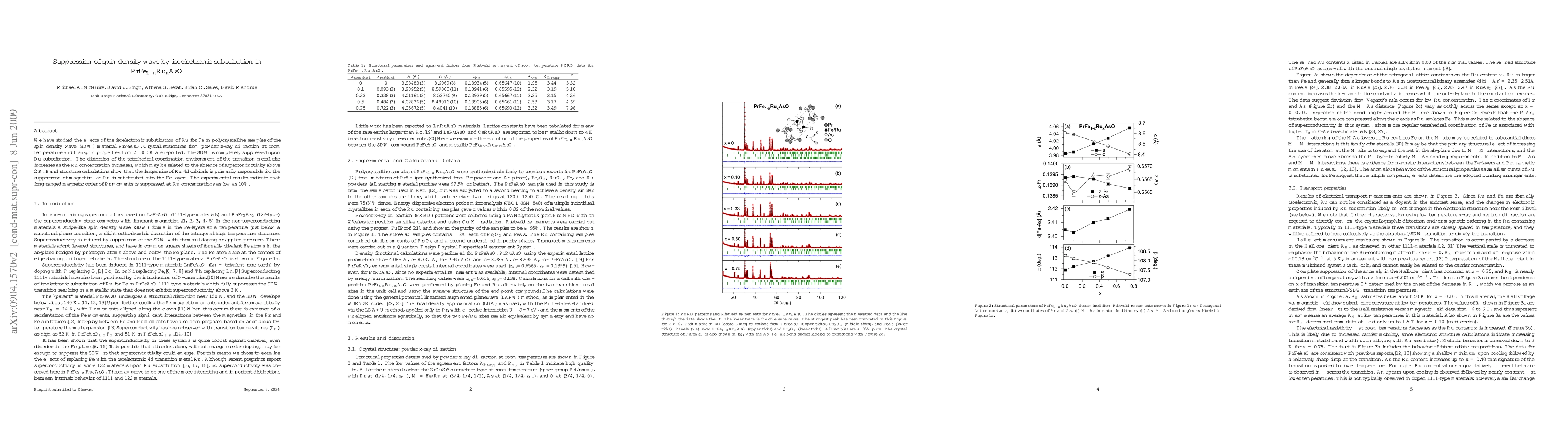 This study investigates the suppression of spin density wave (SDW) in PrFeAsO through isoelectronic substitution of Fe with Ru, revealing complete SDW suppression and structural distortions. Band structure calculations attribute the magnetic suppression to the larger size of Ru 4d orbitals, with magnetic order of Pr moments also diminished at low Ru concentrations.