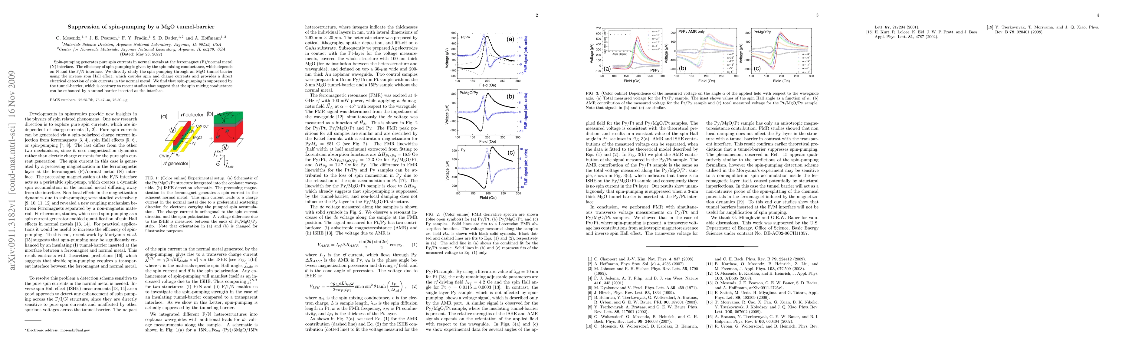 This study investigates the effect of an MgO tunnel-barrier on spin-pumping efficiency at the ferromagnet/normal metal interface, finding suppression rather than enhancement of spin-pumping, contrary to previous suggestions. The inverse spin Hall effect is used for direct electrical detection of spin currents.