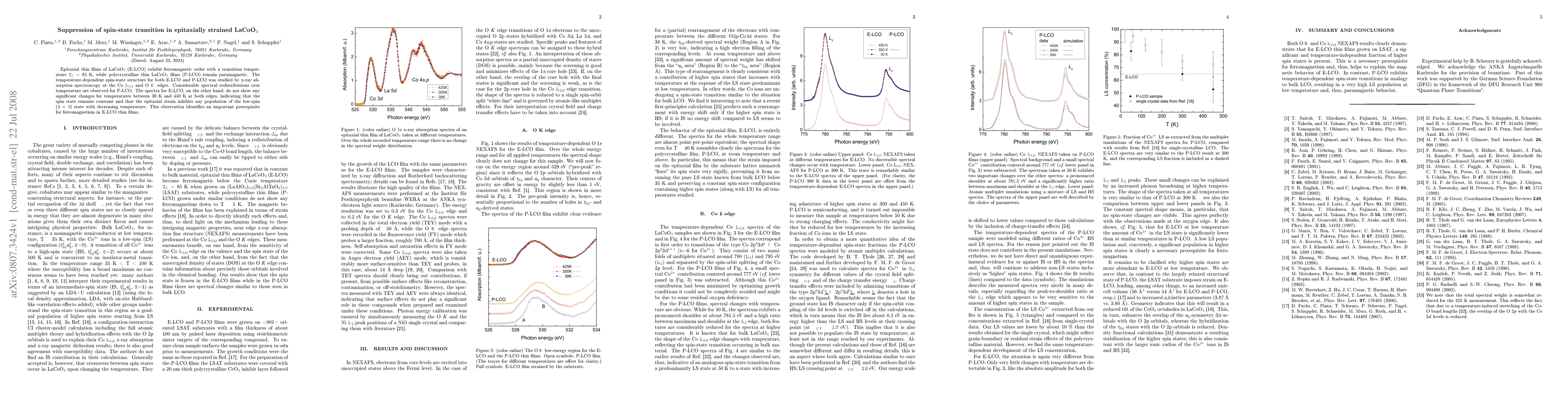 Epitaxial thin films of LaCoO_{3} (E-LCO) exhibit ferromagnetic order with a transition temperature T_c = 85 K, while polycrystalline thin LaCoO_{3} films (P-LCO) remain paramagnetic. The temperature-dependent spin-state structure for both E-LCO and P-LCO was studied by x-ray absorption spectroscopy at the Co L_{2,3} and O K edges. Considerable spectral redistributions over temperature are observed for P-LCO. The spectra for E-LCO, on the other hand, do not show any significant changes for temperatures between 30 K and 450 K at both edges, indicating that the spin state remains constant and that the epitaxial strain inhibits any population of the low-spin (S = 0) state with decreasing temperature. This observation identifies an important prerequisite for ferromagnetism in E-LCO thin films.