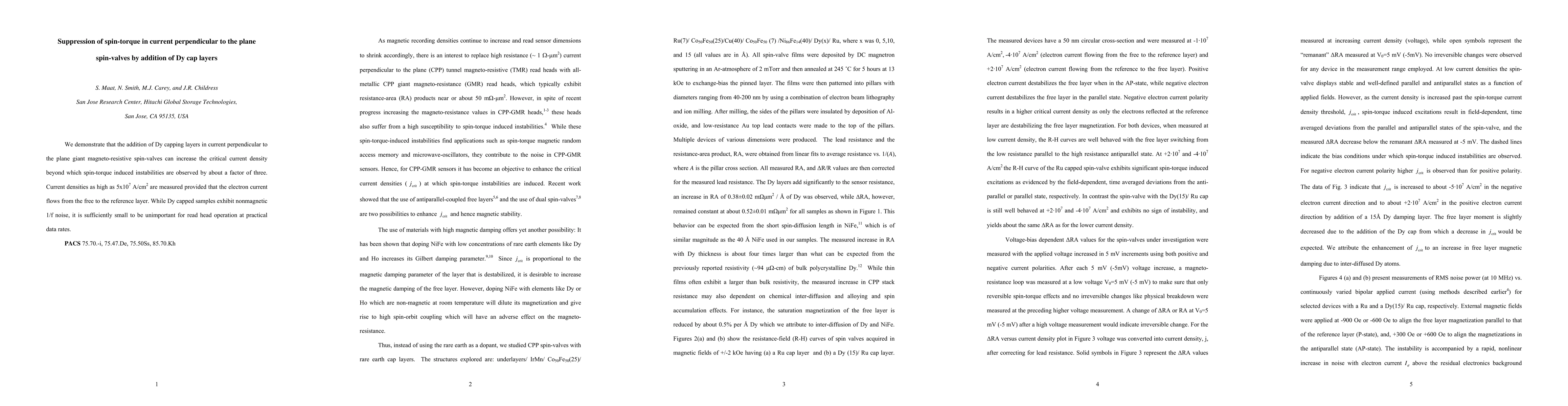 The addition of Dy capping layers in perpendicular spin-valves increases the critical current density by threefold, reaching up to 5e7 A/cm², thereby suppressing spin-torque instabilities, while maintaining negligible noise for practical read head operations.