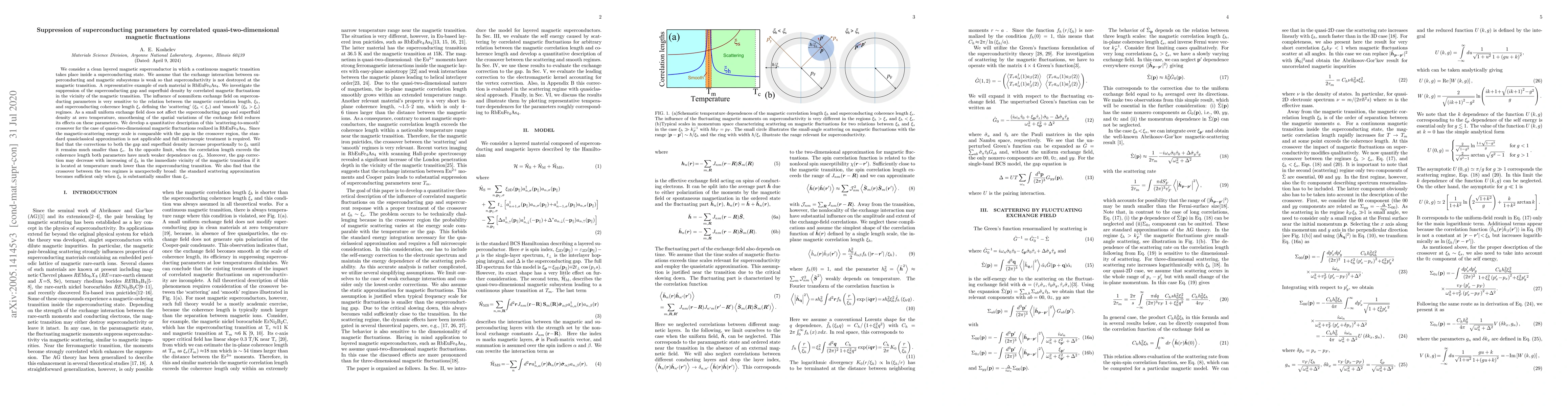 We consider a clean layered magnetic superconductor in which a continuous magnetic transition takes place inside superconducting state and the exchange interaction between superconducting and magnetic subsystems is weak so that superconductivity is not destroyed at the magnetic transition. An example of such material is RbEuFe$_{4}$As$_{4}$. We investigate the suppression of the superconducting gap and superfluid density by correlated magnetic fluctuations in the vicinity of the magnetic transition. The influence of nonuniform exchange field on superconducting parameters is sensitive to the relation between the magnetic correlation length, $\xi_{h}$, and superconducting coherence length $\xi_{s}$ defining the 'scattering' ($\xi_{h}<\xi_{s}$) and 'smooth' ($\xi_{h}>\xi_{s}$) regimes. As a small uniform exchange field does not affect the superconducting gap and superfluid density at zero temperature, smoothening of the spatial variations of the exchange field reduces its effects on these parameters. We develop a quantitative description of this 'scattering-to-smooth' crossover for the case of quasi-two-dimensional magnetic fluctuations. Since the magnetic-scattering probability varies at the energy scale comparable with the gap, the quasiclassical approximation is not applicable in the crossover region and microscopic treatment is required. We find that the corrections to both the gap and superfluid density grow proportionally to $\xi_{h}$ until it remains much smaller than $\xi_{s}$. When $\xi_{h}$ exceeds $\xi_{s}$, both parameters have much weaker dependence on $\xi_{h}$. Moreover, the gap correction may decrease with increasing of $\xi_{h}$ in the vicinity of the magnetic transition. We also find that the crossover is unexpectedly broad: the standard scattering approximation becomes sufficient only when $\xi_{h}$ is substantially smaller than $\xi_{s}$.