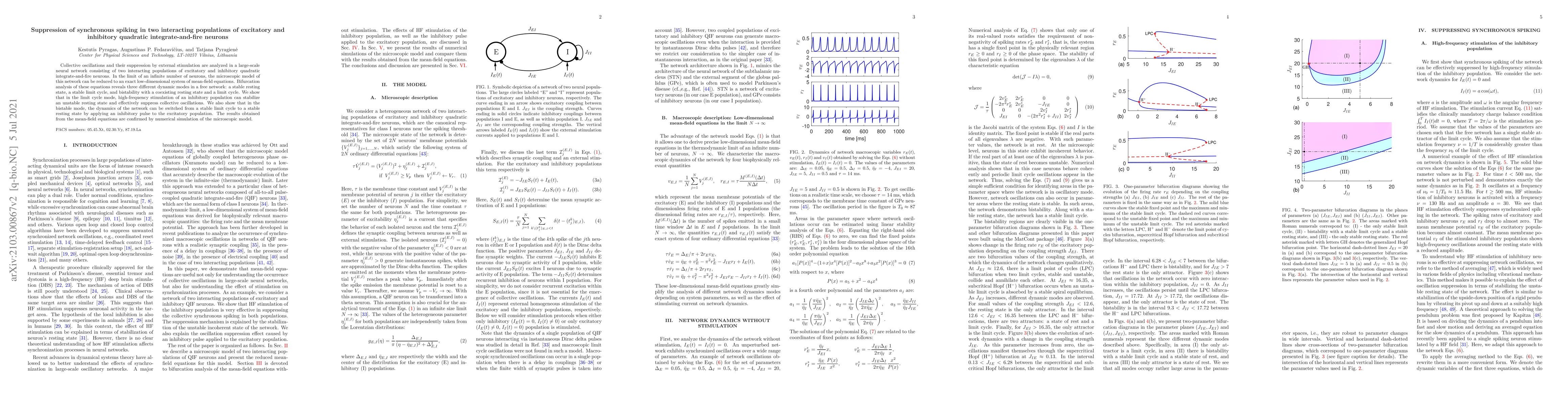 This paper investigates the suppression of synchronous spiking in a neural network of excitatory and inhibitory quadratic integrate-and-fire neurons, using mean-field equations to analyze dynamic modes. High-frequency stimulation of the inhibitory population can stabilize the network and suppress oscillations, confirmed by microscopic model simulations.