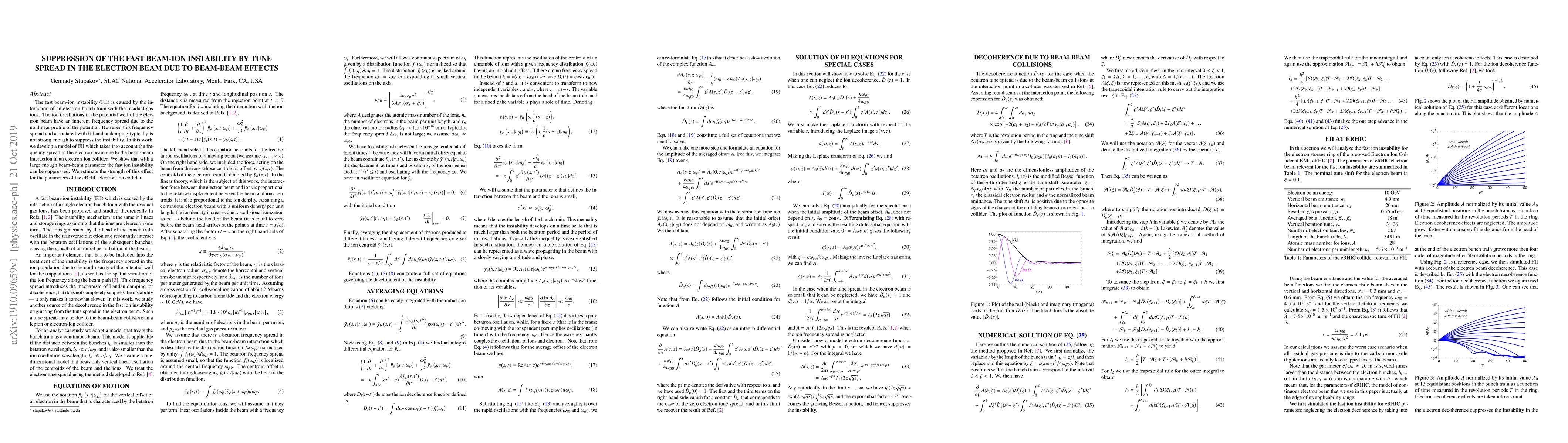 This paper develops a model to suppress the fast beam-ion instability caused by electron bunch interactions with residual gas ions, showing that the beam-beam interaction's tune spread can effectively mitigate the instability. The study estimates the suppression strength for the eRHIC electron-ion collider parameters.