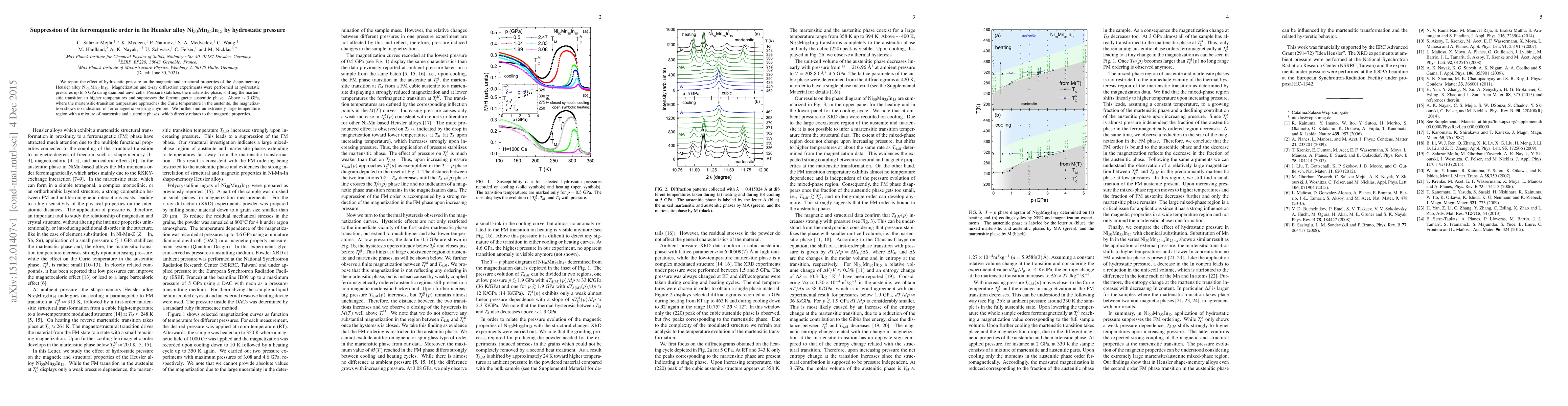 Hydrostatic pressure stabilizes the martensitic phase in a Heusler alloy, suppressing ferromagnetic order and shifting the transition temperature to higher temperatures.