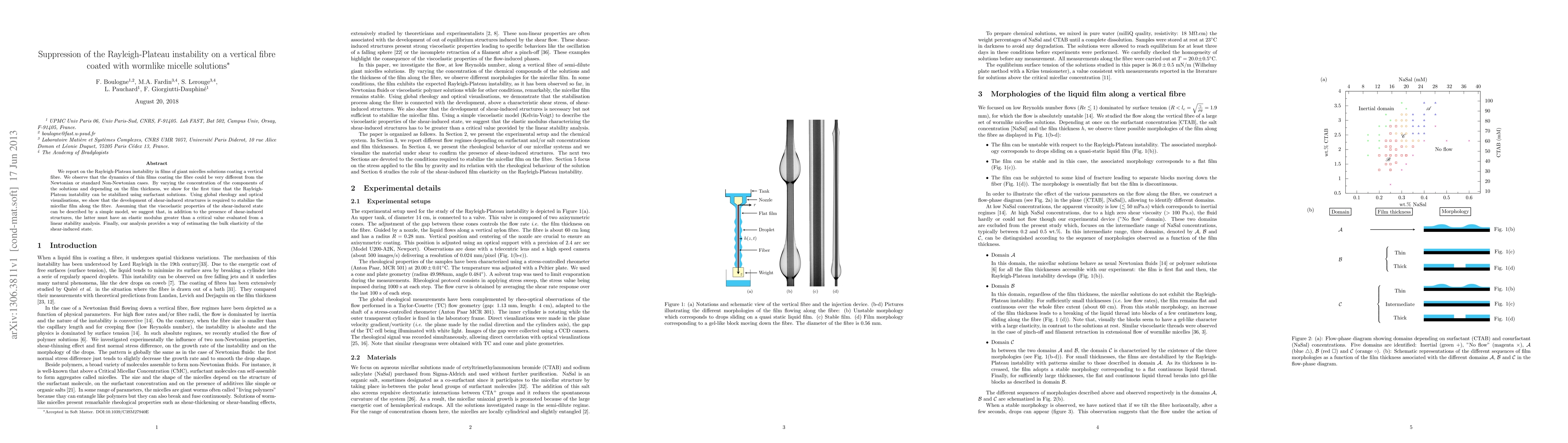 We report on the Rayleigh-Plateau instability in films of giant micelles solutions coating a vertical fibre. We observe that the dynamics of thin films coating the fibre could be very different from the Newtonian or standard Non-Newtonian cases. By varying the concentration of the components of the solutions and depending on the film thickness, we show for the first time that the Rayleigh-Plateau instability can be stabilized using surfactant solutions. Using global rheology and optical visualisations, we show that the development of shear-induced structures is required to stabilize the micellar film along the fibre. Assuming that the viscoelastic properties of the shear-induced state can be described by a simple model, we suggest that, in addition to the presence of shear-induced structures, the latter must have an elastic modulus greater than a critical value evaluated from a linear stability analysis. Finally, our analysis provides a way of estimating the bulk elasticity of the shear-induced state.
