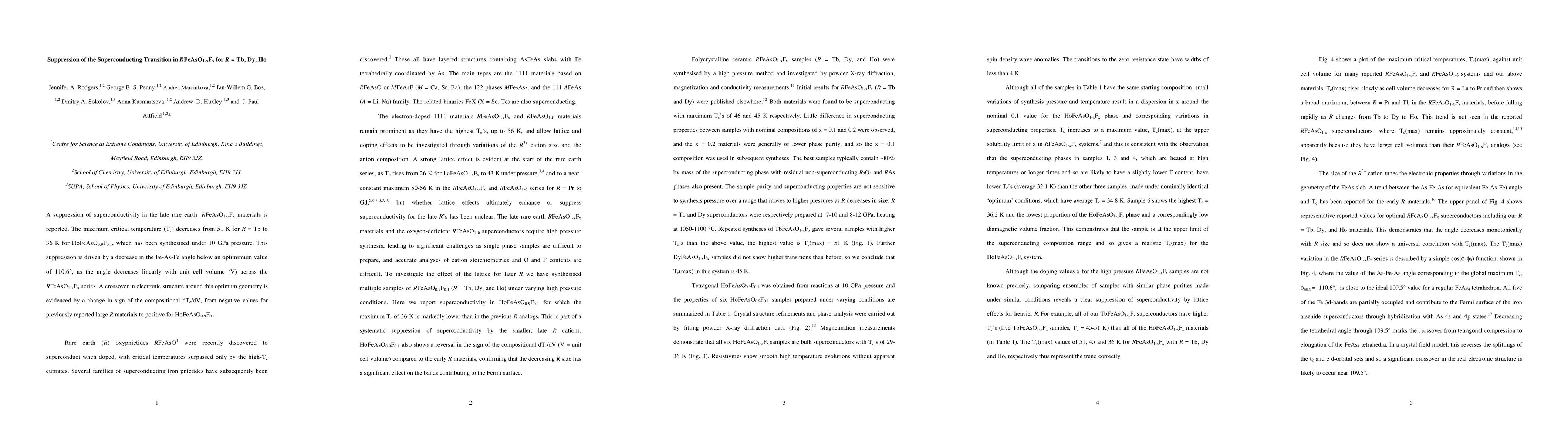 A suppression of superconductivity in the late rare earth RFeAsO1-xFx materials is reported. The maximum critical temperature (Tc) decreases from 51 K for R = Tb to 36 K for HoFeAsO0.9F0.1, which has been synthesised under 10 GPa pressure. This suppression is driven by a decrease in the Fe-As-Fe angle below an optimimum value of 110.6 degrees, as the angle decreases linearly with unit cell volume (V) across the RFeAsO1-xFx series. A crossover in electronic structure around this optimum geometry is evidenced by a change in sign of the compositional dTc/dV, from negative values for previously reported large R materials to positive for HoFeAsO0.9F0.1.