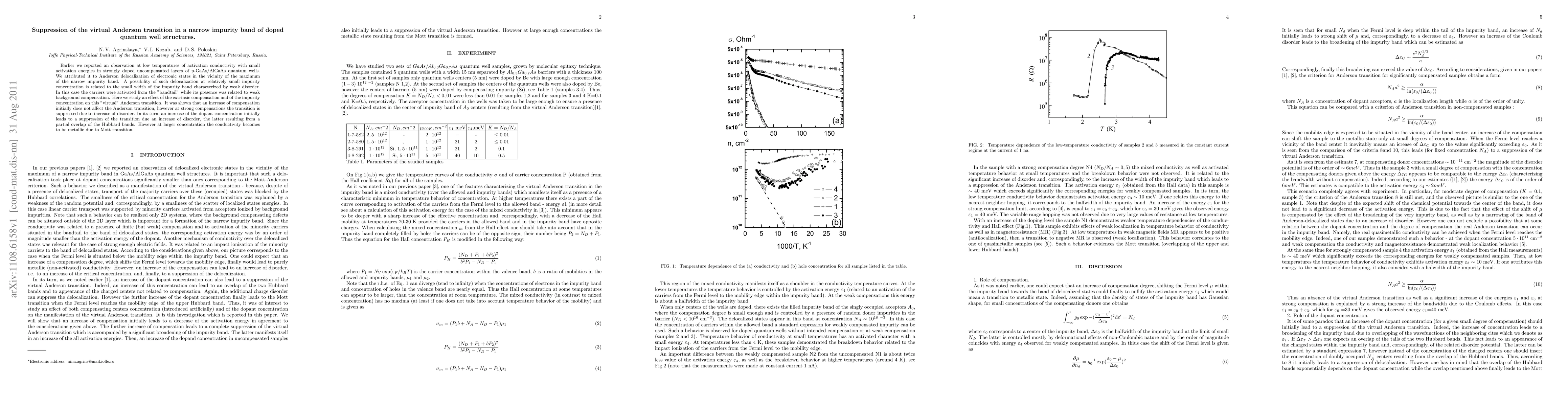 Earlier we reported an observation at low temperatures of activation conductivity with small activation energies in strongly doped uncompensated layers of p-GaAs/AlGaAs quantum wells. We attributed it to Anderson delocalization of electronic states in the vicinity of the maximum of the narrow impurity band. A possibility of such delocalization at relatively small impurity concentration is related to the small width of the impurity band characterized by weak disorder. In this case the carriers were activated from the "bandtail" while its presence was related to weak background compensation. Here we study an effect of the extrinsic compensation and of the impurity concentration on this "virtual" Anderson transition. It was shown that an increase of compensation initially does not affect the Anderson transition, however at strong compensations the transition is suppressed due to increase of disorder. In its turn, an increase of the dopant concentration initially leads to a suppression of the transition due an increase of disorder, the latter resulting from a partial overlap of the Hubbard bands. However at larger concentration the conductivity becomes to be metallic due to Mott transition.