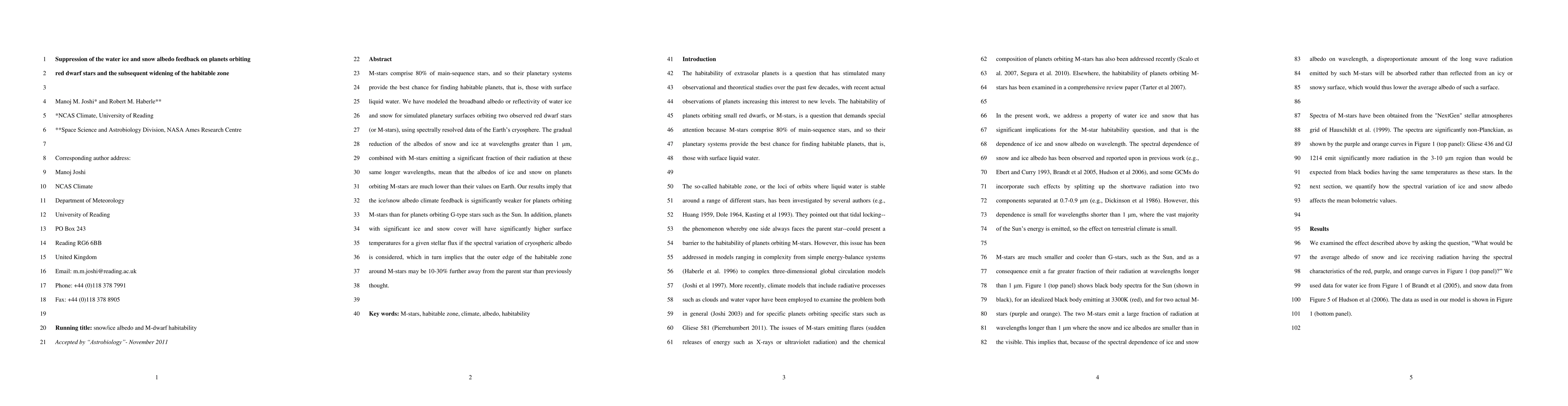 This research models the albedo of water ice and snow on planets orbiting red dwarf stars, finding that the ice/snow albedo feedback is weaker compared to planets around G-type stars. Consequently, the habitable zone around red dwarfs may extend 10-30% further out than previously estimated.