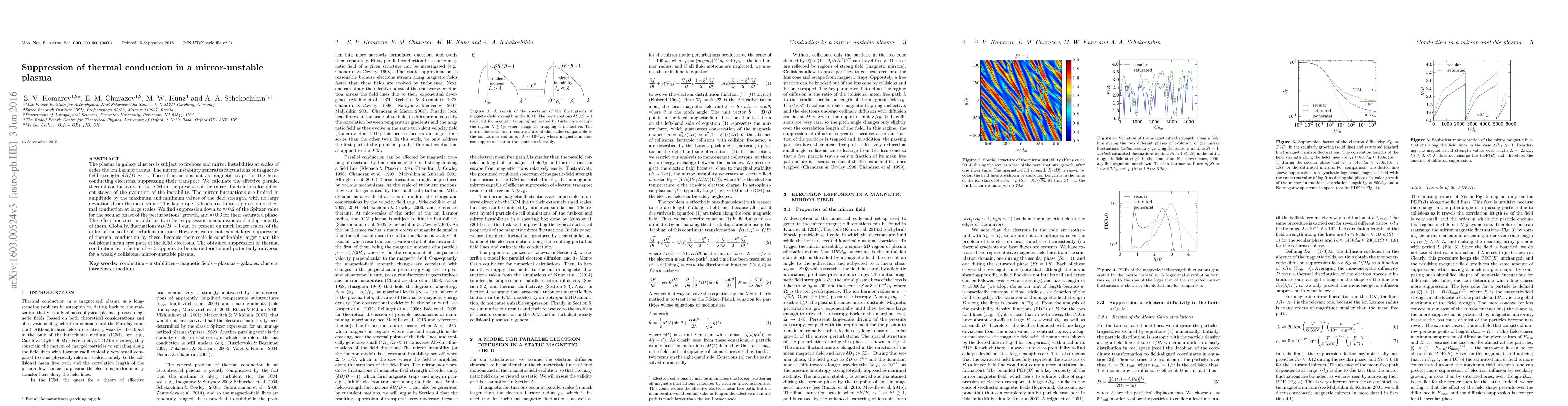 The ICM plasma is subject to firehose and mirror instabilities at scales of order the ion Larmor radius. The mirror instability generates fluctuations of magnetic-field strength $\delta B / B \sim 1$. These fluctuations act as magnetic traps for the heat-conducting electrons, suppressing their transport. We calculate the effective parallel thermal conductivity in the ICM in the presence of the mirror fluctuations for different stages of the evolution of the instability. The mirror fluctuations are limited in amplitude by the maximum and minimum values of the field strength, with no large deviations from the mean value. This key property leads to a finite suppression of thermal conduction at large scales. We find suppression down to $\approx 0.2$ of the Spitzer value for the secular phase of the perturbations' growth, and $\approx 0.3$ for their saturated phase. The effect operates in addition to other suppression mechanisms and independently of them. Globally, fluctuations $\delta B / B \sim 1$ can be present on much larger scales, of the order of the scale of turbulent motions. However, we do not expect large suppression of thermal conduction by these, because their scale is considerably larger than the collisional mean free path of the ICM electrons. The obtained suppression of thermal conduction by a factor of $\sim 5$ appears to be characteristic and potentially universal for a weakly collisional mirror-unstable plasma.
