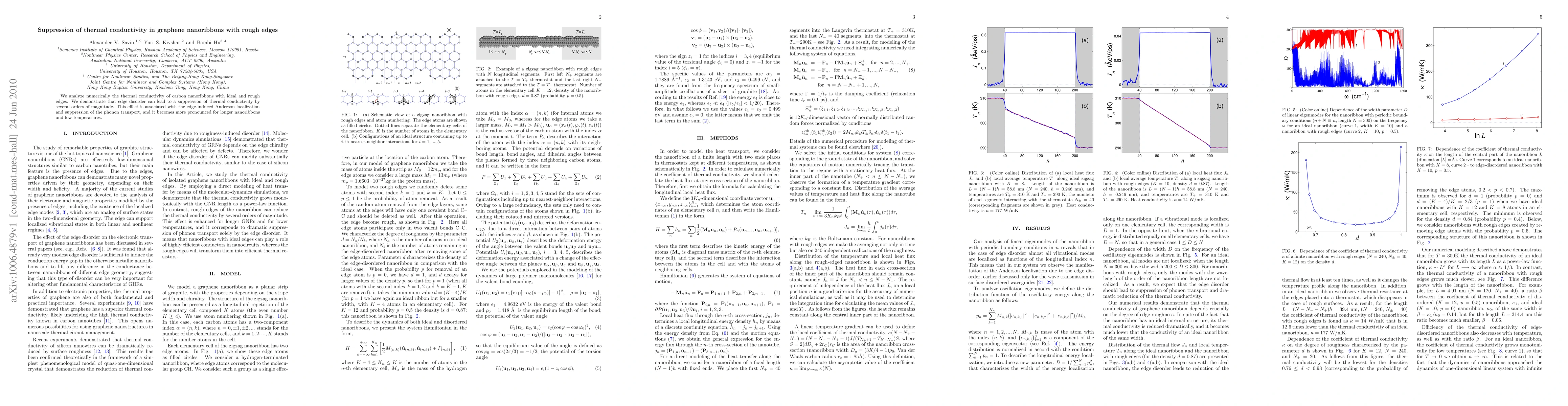 Summary: This study numerically shows that rough edges in graphene nanoribbons significantly reduce thermal conductivity by several orders of magnitude due to edge-induced Anderson localization, with the effect being more pronounced in longer nanoribbons and at low temperatures.