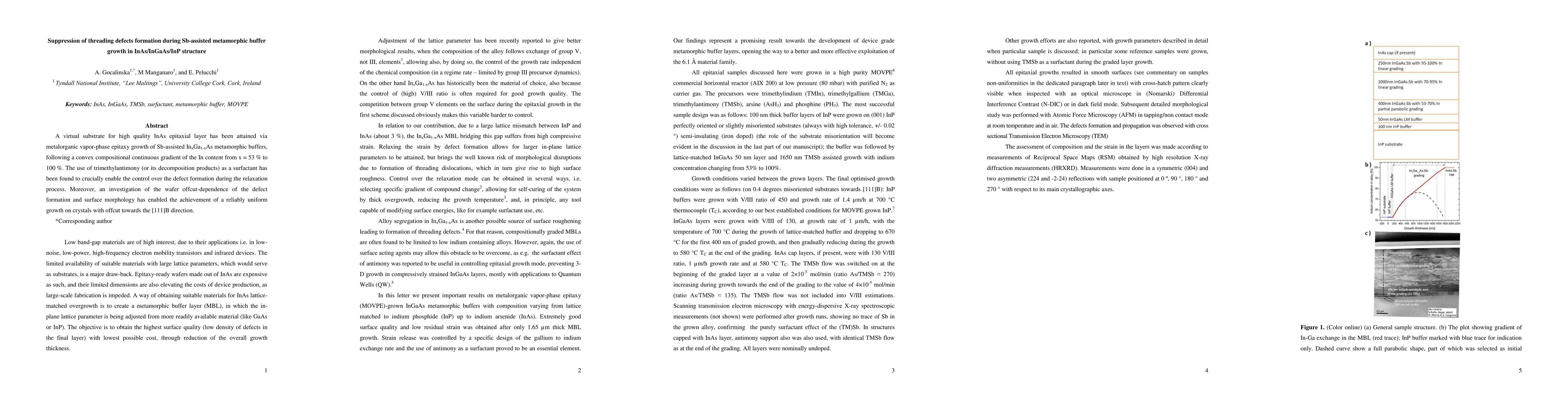 This paper investigates the use of Sb-assisted metamorphic buffer growth in InAs/InGaAs/InP structures to suppress threading defects, achieving high-quality InAs epitaxial layers via metalorganic vapor-phase epitaxy. The study finds that trimethylantimony acts as a surfactant, enabling control over defect formation and resulting in uniform growth on crystals with [111]B offcut.