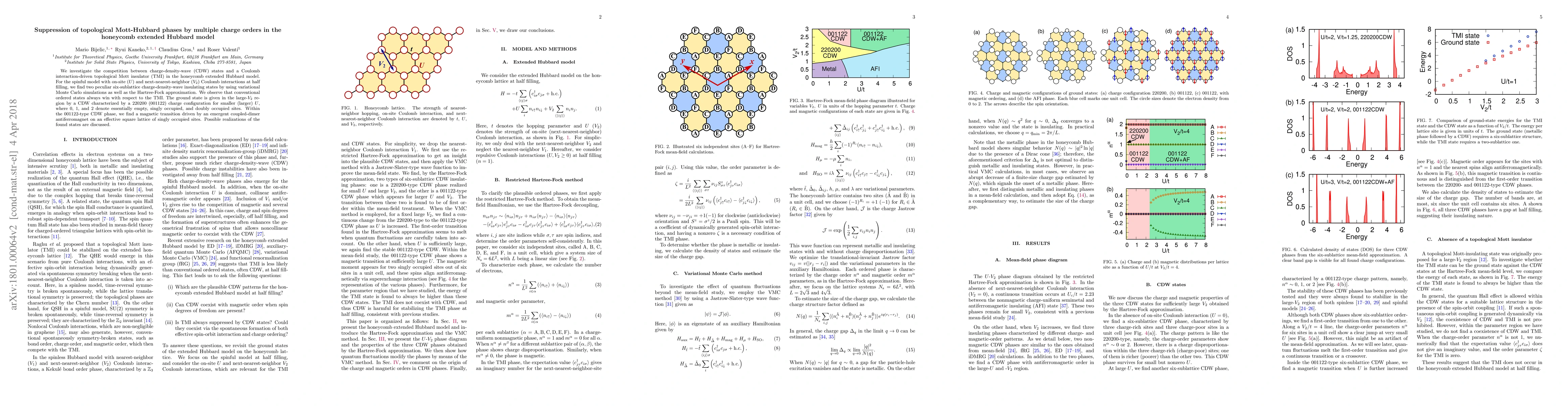 We investigate the competition between charge-density-wave (CDW) states and a Coulomb interaction-driven topological Mott insulator (TMI) in the honeycomb extended Hubbard model. For the spinful model with on-site ($U$) and next-nearest-neighbor ($V_2$) Coulomb interactions at half filling, we find two peculiar six-sublattice charge-density-wave insulating states by using variational Monte Carlo simulations as well as the Hartree-Fock approximation. We observe that conventional ordered states always win with respect to the TMI. The ground state is given in the large-$V_2$ region by a CDW characterized by a 220200 (001122) charge configuration for smaller (larger) $U$, where 0, 1, and 2 denote essentially empty, singly occupied, and doubly occupied sites. Within the 001122-type CDW phase, we find a magnetic transition driven by an emergent coupled-dimer antiferromagnet on an effective square lattice of singly occupied sites. Possible realizations of the found states are discussed.