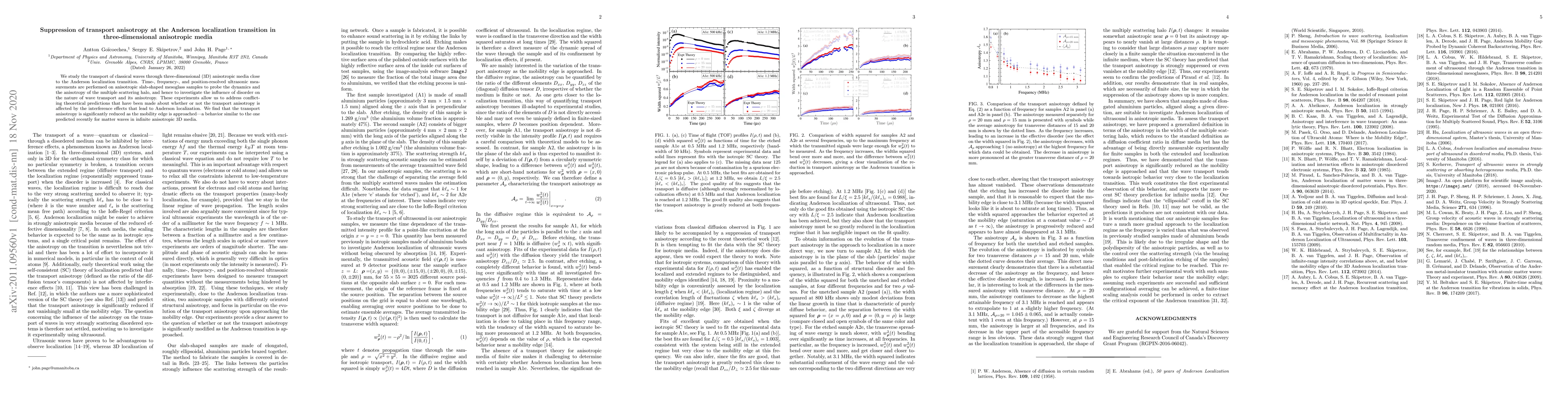 We study the transport of classical waves through three-dimensional (3D) anisotropic media close to the Anderson localization transition. Time-, frequency-, and position-resolved ultrasonic measurements are performed on anisotropic slab-shaped mesoglass samples to probe the dynamics and the anisotropy of the multiple scattering halo, and hence to investigate the influence of disorder on the nature of wave transport and its anisotropy. These experiments allow us to address conflicting theoretical predictions that have been made about whether or not the transport anisotropy is affected by the interference effects that lead to Anderson localization. We find that the transport anisotropy is significantly reduced as the mobility edge is approached---a behavior similar to the one predicted recently for matter waves in infinite anisotropic 3D media.