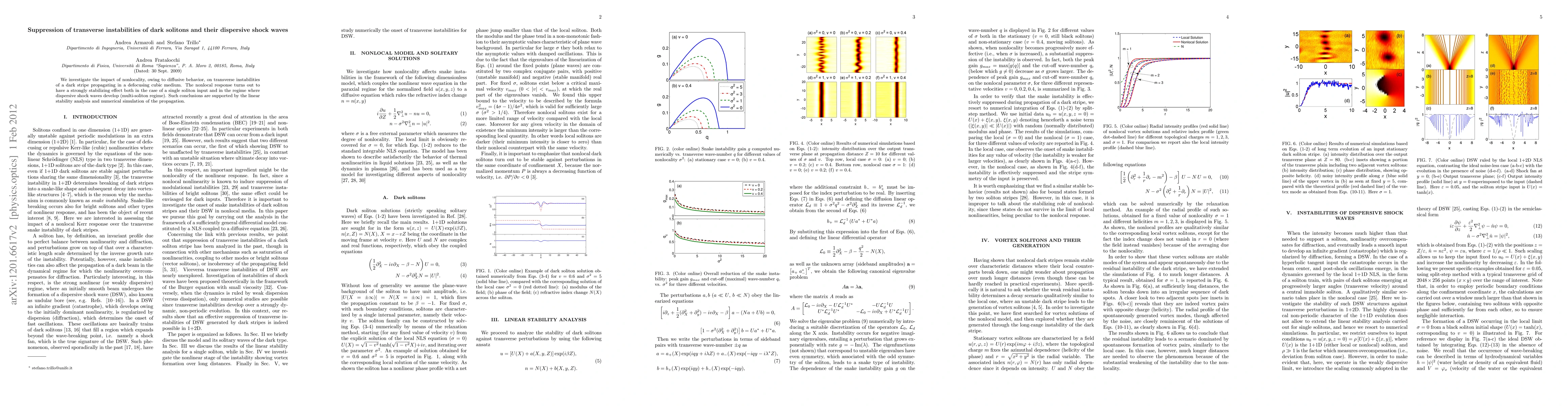 This paper examines how nonlocal effects due to diffusive behavior stabilize transverse instabilities in dark solitons and dispersive shock waves in a defocusing cubic medium, supported by linear stability analysis and numerical simulations.