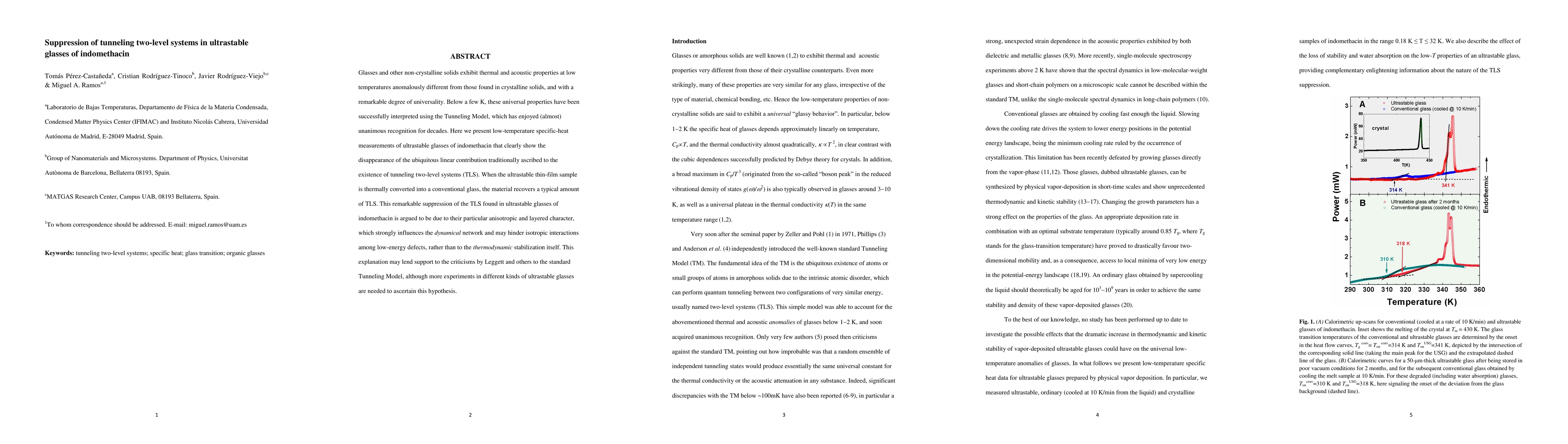 This study demonstrates the suppression of tunneling two-level systems (TLS) in ultrastable glasses of indomethacin through specific-heat measurements, revealing a disappearance of the linear contribution typically attributed to TLS. The findings suggest that the anisotropic and layered structure of these ultrastable glasses hinders isotropic interactions among defects, challenging the conventional Tunneling Model.