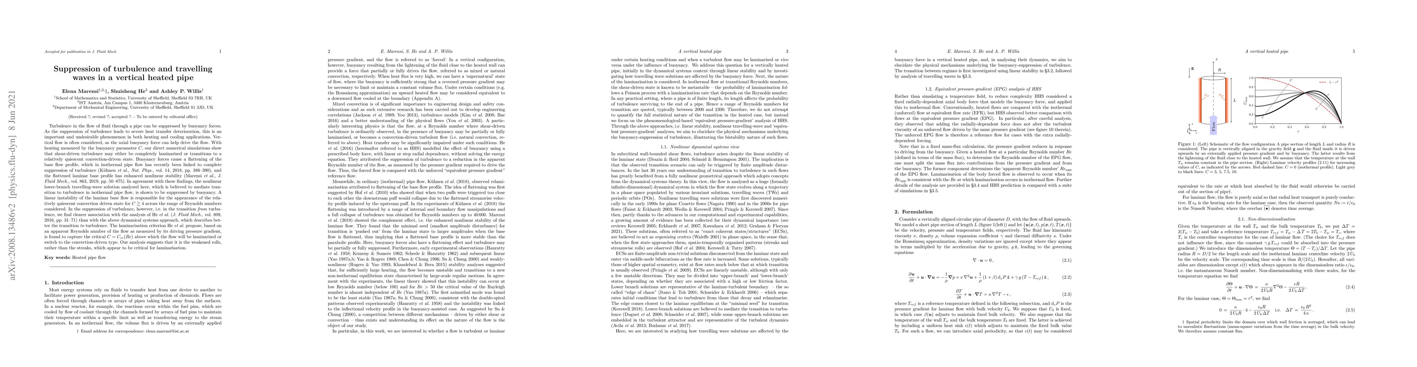 Turbulence in the flow of fluid through a pipe can be suppressed by buoyancy forces. As the suppression of turbulence leads to severe heat transfer deterioration, this is an important and undesirable phenomenon in both heating and cooling applications. Vertical flow is often considered, as the axial buoyancy force can help drive the flow. With heating measured by the buoyancy parameter $C$, our DNS show that shear-driven turbulence may either be completely laminarised or transitions to a relatively quiescent convection-driven state. Buoyancy forces cause a flattening of the base flow profile, which in isothermal pipe flow has recently been linked to complete suppression of turbulence (K\"{u}hnen et al. Nat. Phys., 2018), and the flattened laminar base profile has enhanced nonlinear stability (Marensi et al. JFM, 2019). In agreement with these findings, the nonlinear lower-branch travelling-wave solution analysed here, which is believed to mediate transition to turbulence in isothermal pipe flow, is shown to be suppressed by buoyancy. A linear instability of the laminar base flow is responsible for the appearance of the relatively quiescent convection driven state for $C\gtrsim 4$ across the range of Reynolds numbers considered. In the suppression of turbulence, however, i.e. in the transition from turbulence, we find clearer association with the analysis of He et al. (JFM, 2016) than with the above dynamical systems approach, which describes better the transition to turbulence. The laminarisation criterion He et al. propose, based on an apparent Reynolds number of the flow as measured by its driving pressure gradient, is found to capture the critical $C=C_{cr}(Re)$ above which the flow will be laminarised or switch to the convection-driven type. Our analysis suggests that it is the weakened rolls, rather than the streaks, which appear to be critical for laminarisation.