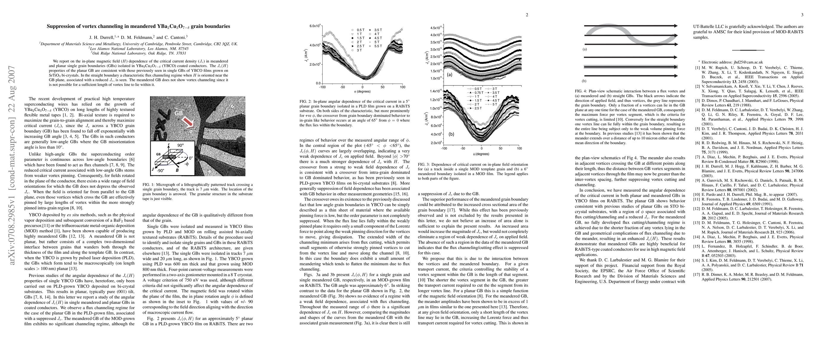 The paper presents a detailed analysis of the angular dependence of Jc(H) in both planar and meandered GBs in YBCO coated conductors, highlighting the suppression of vortex channeling in meandered GBs.