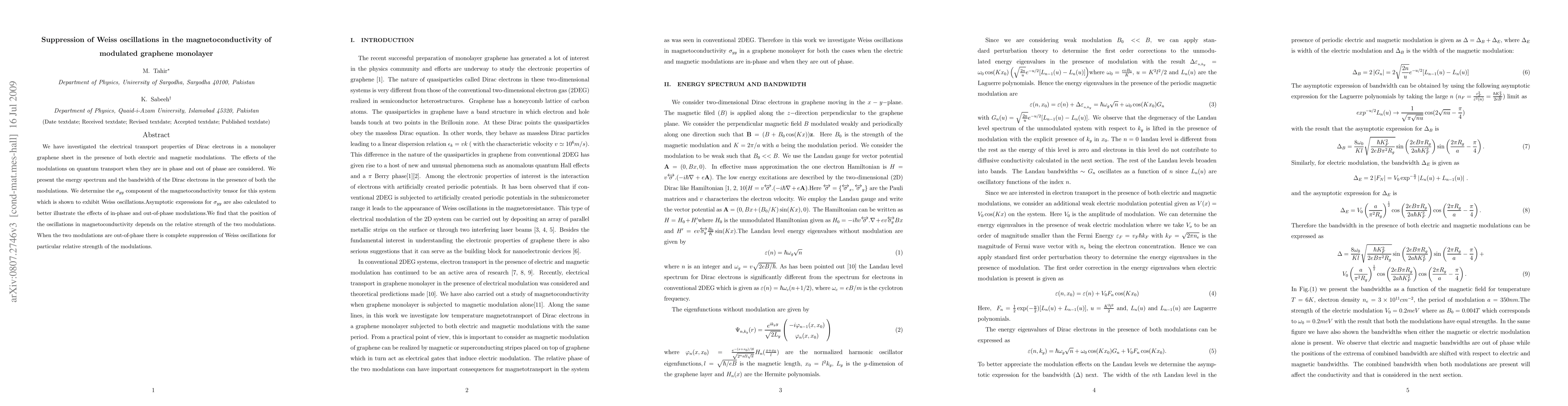 This paper investigates the electrical transport properties of Dirac electrons in modulated graphene, finding that Weiss oscillations in magnetoconductivity are suppressed when electric and magnetic modulations are out-of-phase, depending on their relative strengths. The study provides asymptotic expressions for magnetoconductivity and reveals a complete suppression of oscillations under specific conditions.
