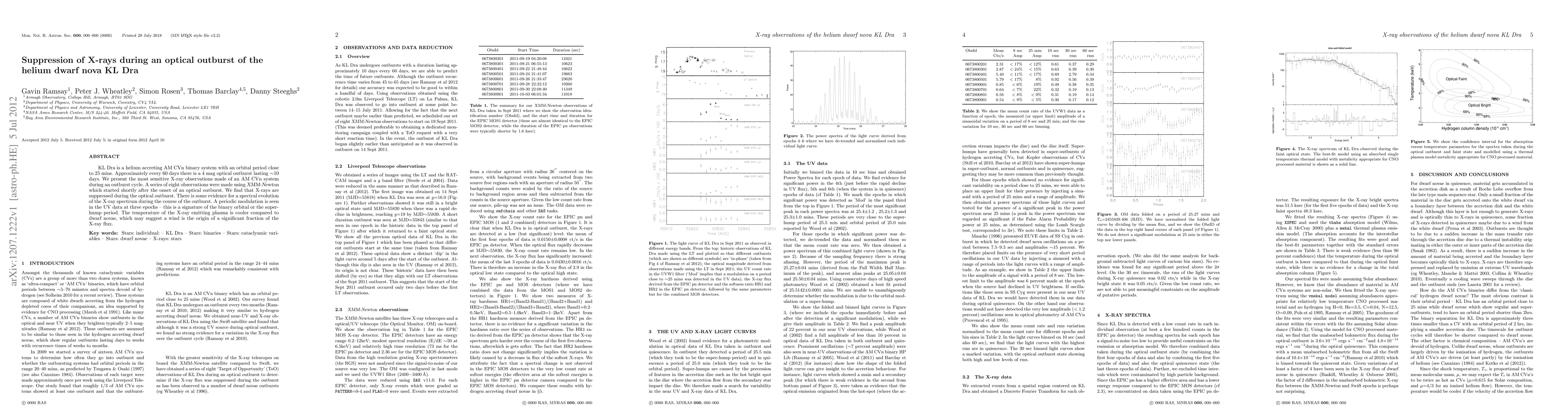 This study observes the helium dwarf nova KL Dra during an optical outburst using XMM-Newton, finding significant X-ray suppression. Evidence suggests a spectral evolution and a periodic modulation in UV data, indicating the binary orbital period, while the cooler X-ray plasma temperature hints at a wind contributing to the X-ray flux.