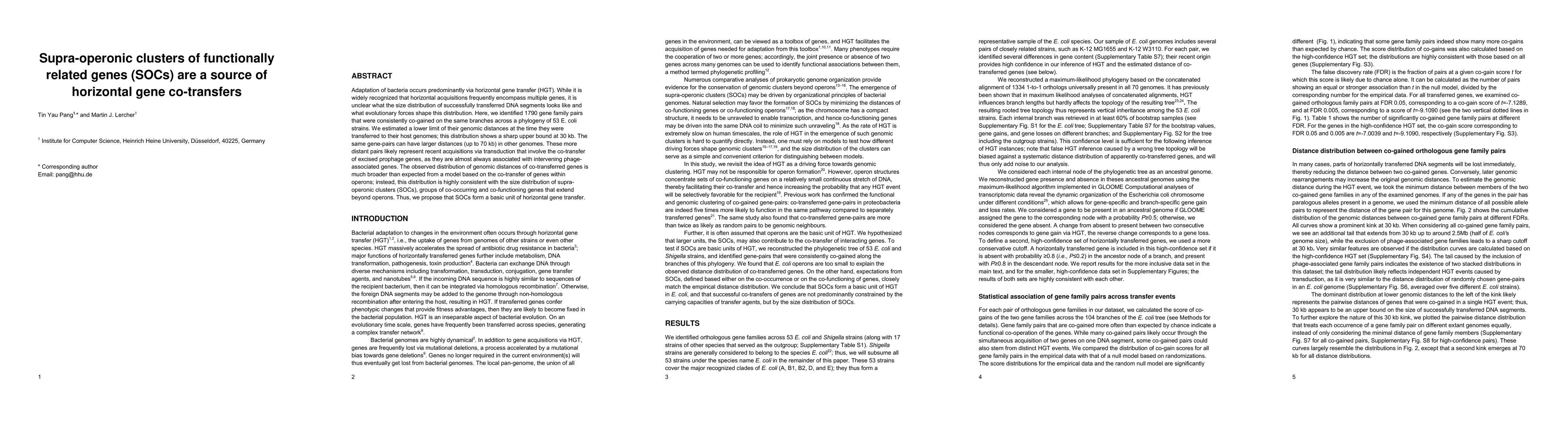 This study identifies 1790 gene pairs consistently co-gained across E. coli strains, revealing that horizontal gene transfer often involves supra-operonic clusters (SOCs) rather than just operons. The findings suggest SOCs are a fundamental unit in horizontal gene co-transfer.