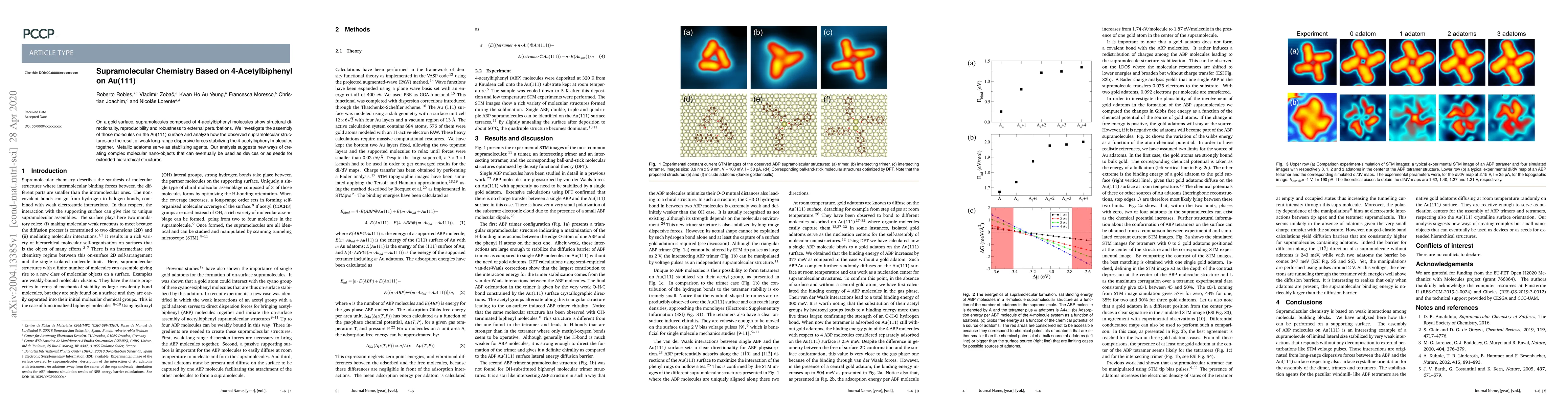 On a gold surface, supramolecules composed of 4-acetylbiphenyl molecules show structural directionality, reproducibility and robustness to external perturbations. We investigate the assembly of those molecules on the Au(111) surface and analyze how the observed supramolecular structures are the result of weak long-range dispersive forces stabilizing the 4-acetylbiphenyl molecules together. Metallic adatoms serve as stabilizing agents. Our analysis suggests new ways of creating complex molecular nano-objects that can eventually be used as devices or as seeds for extended hierarchical structures.