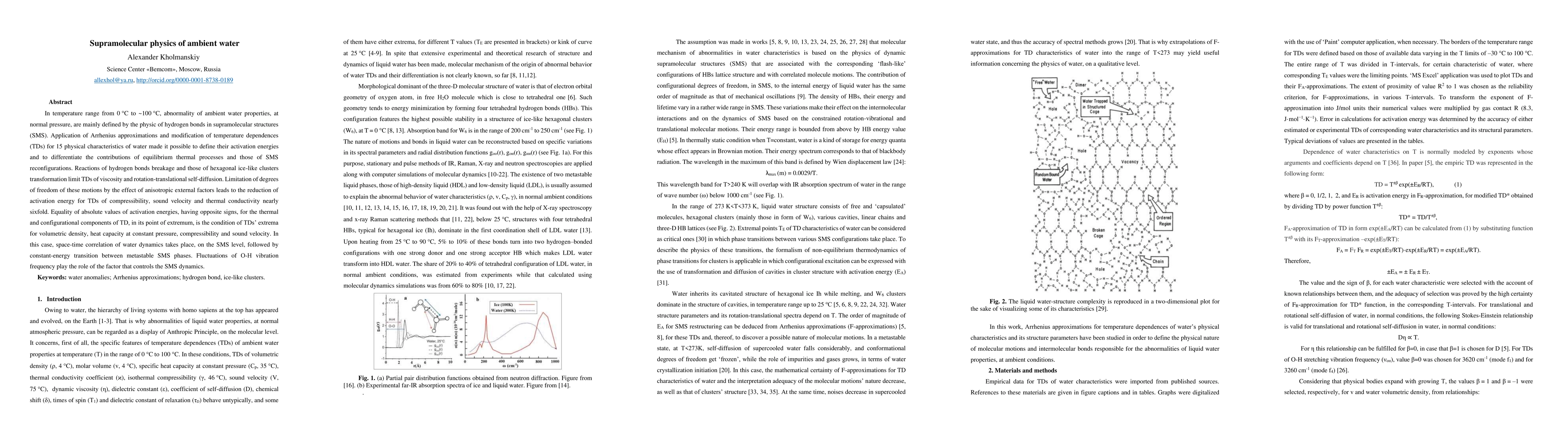 Researchers studied water's properties from 0 to 100C and found that supramolecular structures influence its behavior, leading to reduced activation energies for certain physical characteristics. This suggests a correlation between water dynamics on the molecular level and changes in macroscopic properties.