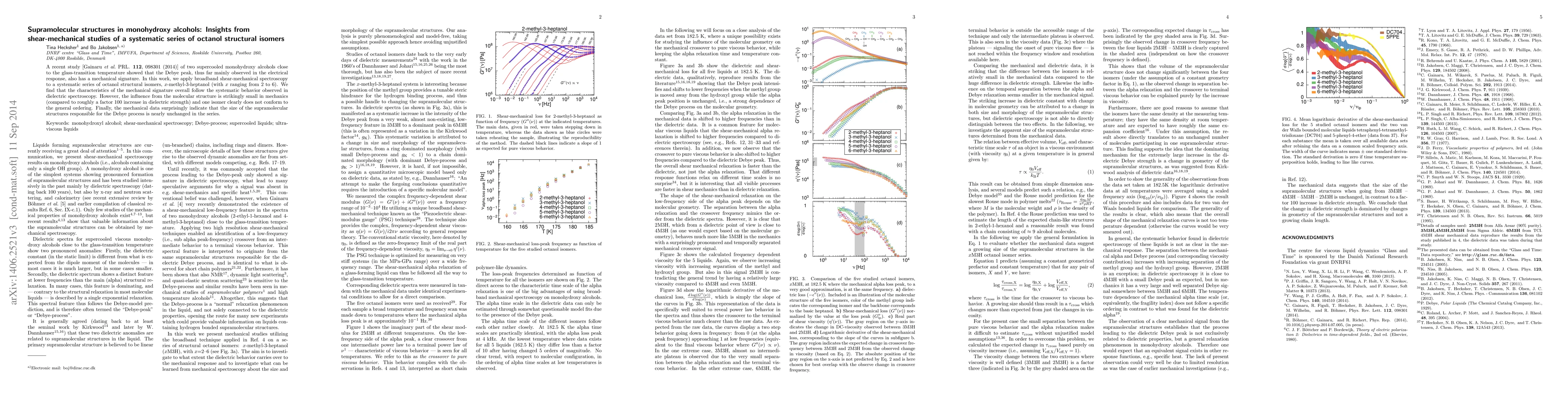 A recent study [Gainaru et al. PRL., 112, 098301 (2014)] of two supercooled monohydroxy alcohols close to the glass-transition temperature showed that the Debye peak, thus far mainly observed in the electrical response, also has a mechanical signature. In this work, we apply broadband shear-mechanical spectroscopy to a systematic series of octanol structural isomers, x-methyl-3-heptanol (with x ranging from 2 to 6). We find that the characteristics of the mechanical signature overall follow the systematic behavior observed in dielectric spectroscopy. However, the influence from the molecular structure is strikingly small in mechanics (compared to roughly a factor 100 increase in dielectric strength) and one isomer clearly does not conform to the general ordering. Finally, the mechanical data surprisingly indicate that the size of the supramolecular structures responsible for the Debye process is nearly unchanged in the series.