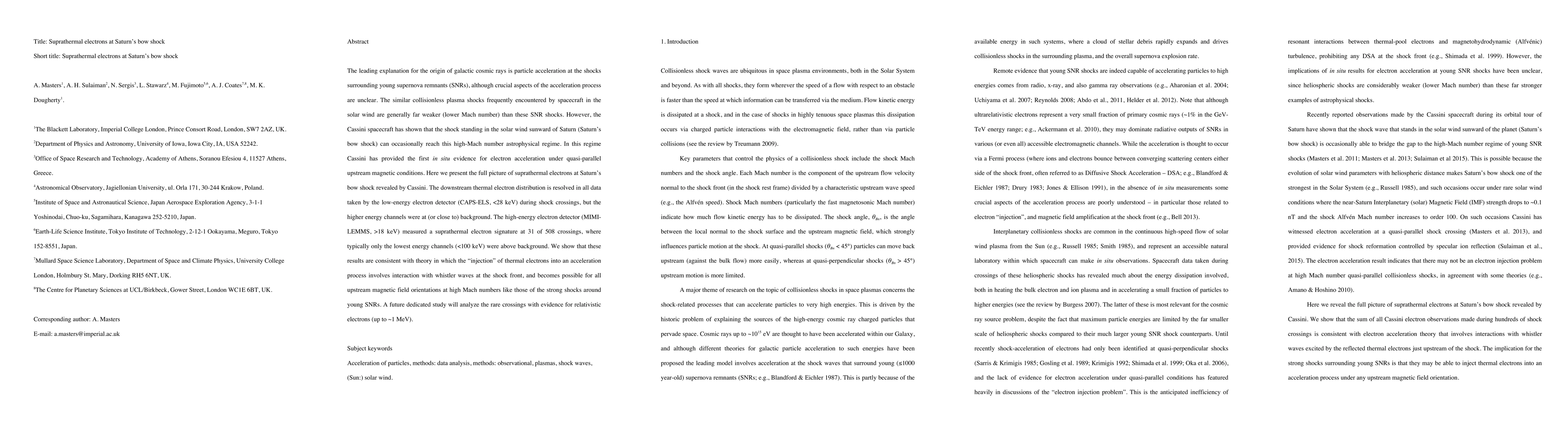 This paper investigates the acceleration of suprathermal electrons at Saturn's bow shock, revealing that high-Mach number shocks can accelerate electrons similarly to those in young supernova remnants. Cassini spacecraft data show that thermal electrons are consistently accelerated, with higher energy electrons only occasionally detected above background levels.