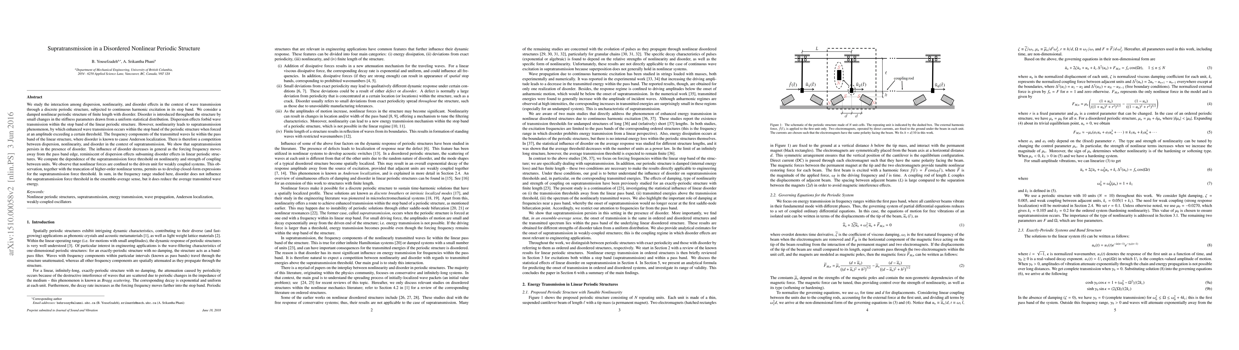 We study the interaction among dispersion, nonlinearity, and disorder effects in the context of wave transmission through a discrete periodic structure, subjected to continuous harmonic excitation in its stop band. We consider a damped nonlinear periodic structure of finite length with disorder. Disorder is introduced throughout the structure by small changes in the stiffness parameters drawn from a uniform statistical distribution. Dispersion effects forbid wave transmission within the stop band of the linear periodic structure. However, nonlinearity leads to supratransmission phenomenon, by which enhanced wave transmission occurs within the stop band of the periodic structure when forced at an amplitude exceeding a certain threshold. The frequency components of the transmitted waves lie within the pass band of the linear structure, where disorder is known to cause Anderson localization. There is therefore a competition between dispersion, nonlinearity, and disorder in the context of supratransmission. We show that supratransmission persists in the presence of disorder. The influence of disorder decreases in general as the forcing frequency moves away from the pass band edge, reminiscent of dispersion effects subsuming disorder effects in linear periodic structures. We compute the dependence of the supratransmission force threshold on nonlinearity and strength of coupling between units. We observe that nonlinear forces are confined to the driven unit for weakly coupled systems. This observation, together with the truncation of higher-order nonlinear terms, permits us to develop closed-form expressions for the supratransmission force threshold. In sum, in the frequency range studied here, disorder does not influence the supratransmission force threshold in the ensemble-average sense, but it does reduce the average transmitted wave energy.