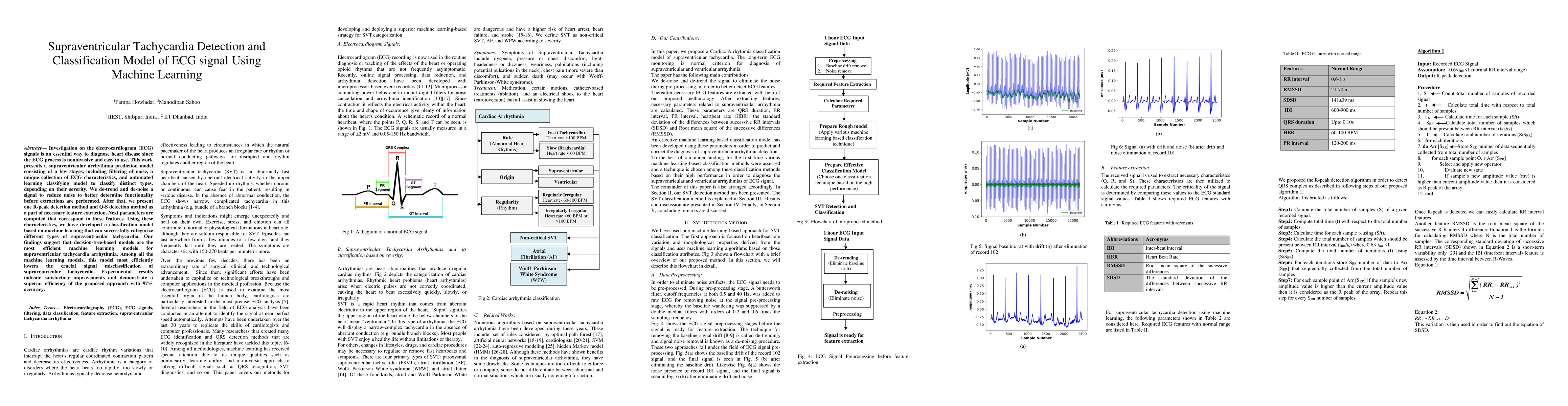 This paper proposes a machine learning model for detecting and classifying supraventricular tachycardia from ECG signals, involving noise reduction, feature extraction, and decision-tree-based classification. The model achieves 97% accuracy, demonstrating significant improvements over other methods.