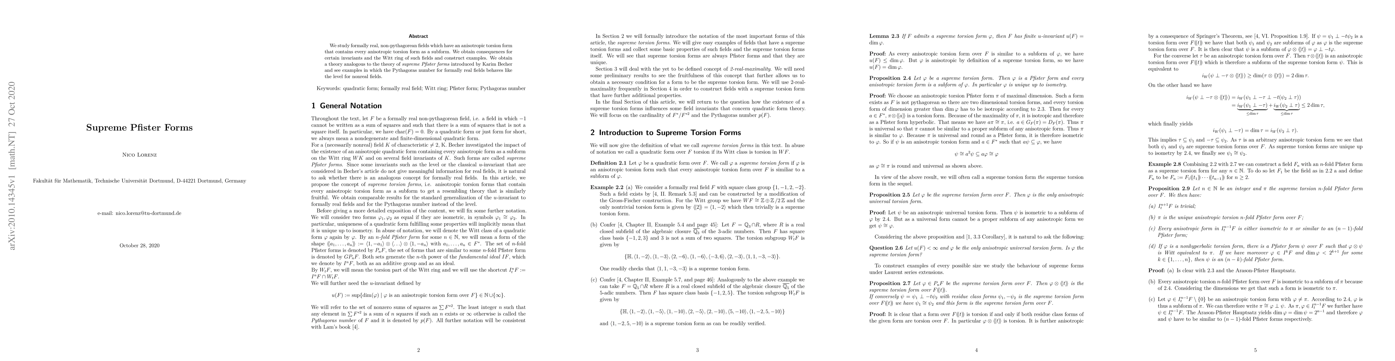We study formally real, non-pythagorean fields which have an anisotropic torsion form that contains every anisotropic torsion form as a subform. We obtain consequences for certain invariants and the Witt ring of such fields and construct examples. We obtain a theory analogous to the theory of supreme Pfister forms introduced by Karim Becher and see examples in which the Pythagoras number for formally real fields behaves like the level for nonreal fields.
